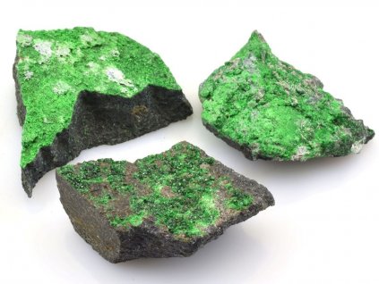 Nabídka zeleného granátu uvarovitu z hlubiného dolu na Urale (Rusko). Krystaly malých rozměrů často porůstají celou plochu chromitové podložky. Uvarovit je jeden z nejvzácnějších granátů. Objeven byl G.H.Hessem v roce 1832 a pojmenován byl na počest ruského státníka a amatérského mineraloga Sergeje Uvarova. Uvarovit je jedním z mála granátů, který má výhradně zelenou barvu, což je způsobeno přítomností chromu v jeho chemickém složení.