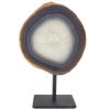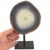 Silný, oboustranně leštěný achátový plátek na kovovém stojánku.