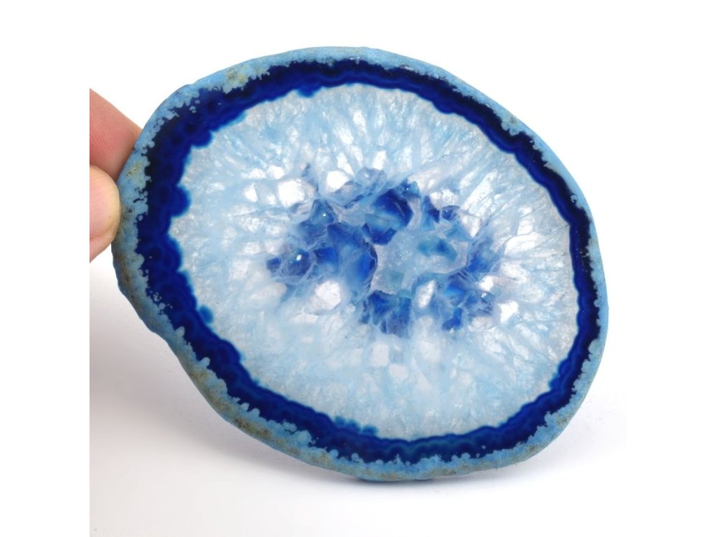 Oboustranně leštěný barvený (modrý) achátový plátek, jehož přírodní kresba vynikne při pohledu proti světlu.