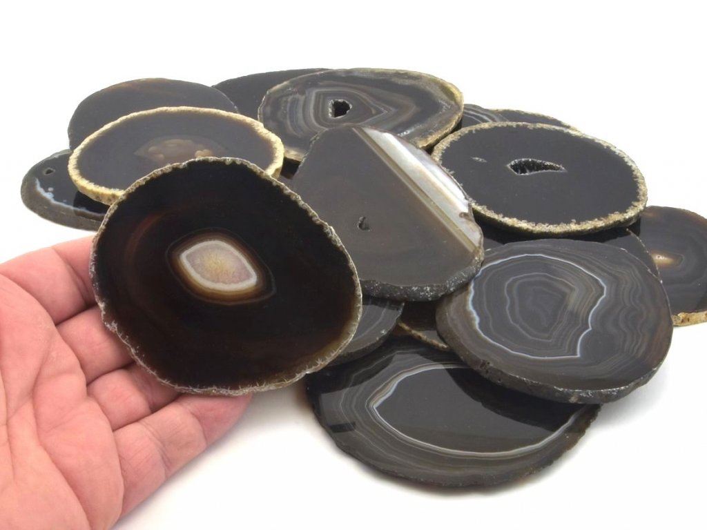 Jedná se o oboustranně leštěné, barvené achátové plátky z Brazílie. Přírodní kresba achátů vynikne při pohledu proti světlu.