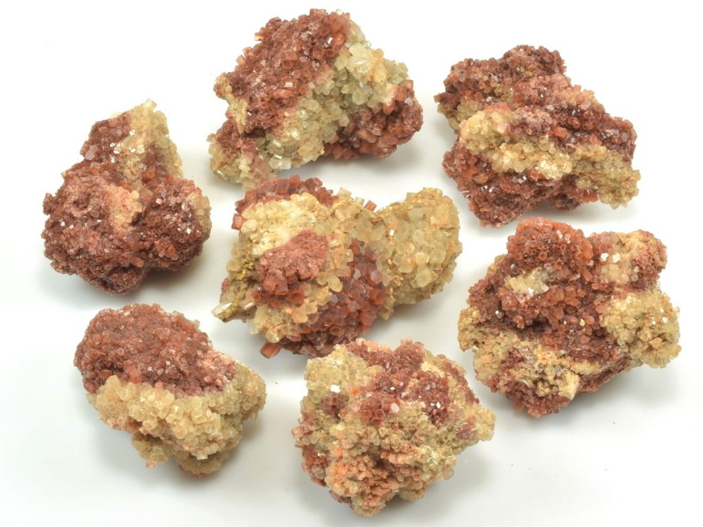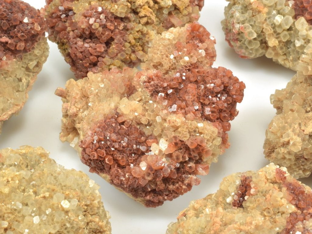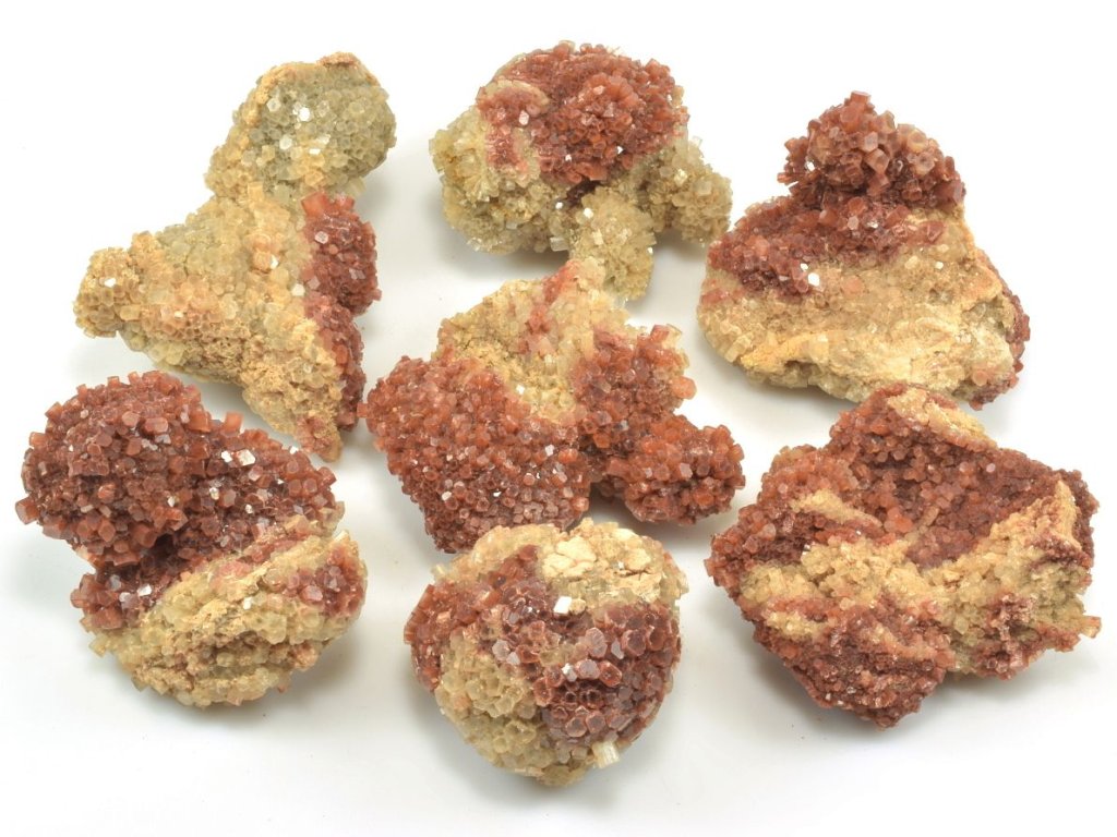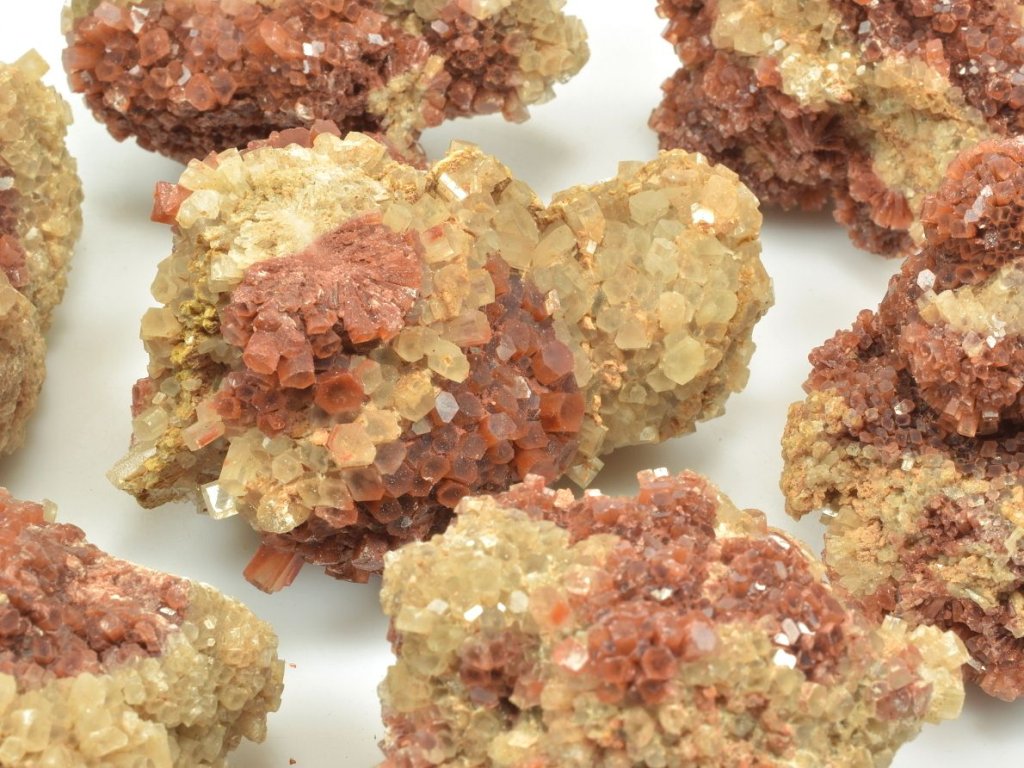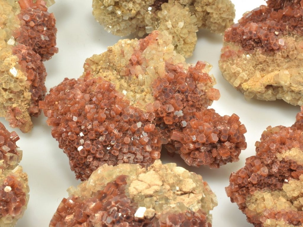 Charakteristickým rysem těchto drúz je kombinace dvou barev, krémové (šedé) a červenohnědé, která vzniká přítomností železitých inkluzí. Dvoubarevné drúzy krystalů představují velmi estetické a sběratelsky atraktivní exempláře. Všechny vzorky těchto aragonitů pocházejí z oblasti Tazouta v Maroku. Agregáty tvoří srůst sloupečkovitých pseudohexagonálních aragonitových krystalů. V každém vzorku v nabídce lze pozorovat střídání světlých a sytě zbarvených částí.