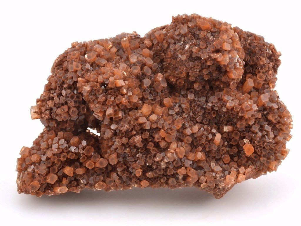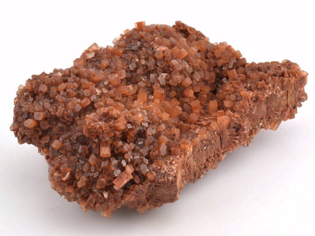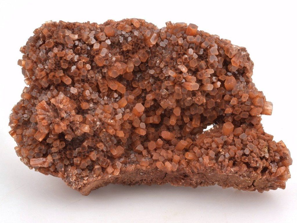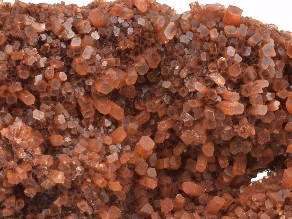Drúza drobných sloupečkovitých krystalů aragonitu původem z Maroka. Vzorky z této lokality mají často červenohnědé zbarvení způsobené železnými inkluzemi. Na lokalitě se nacházejí také dvoubarevné, bílé, šedé nebo čiré srůsty.