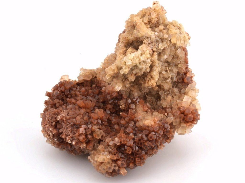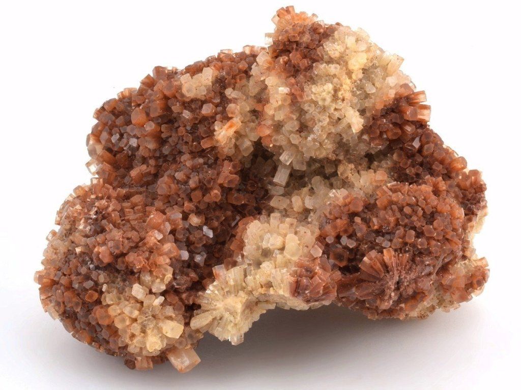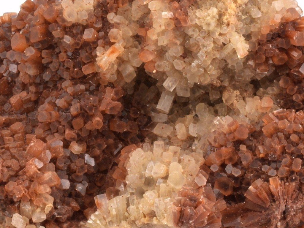 Drúza drobných sloupečkovitých krystalů aragonitu původem z Maroka. Vzorky z této lokality mají často červenohnědé zbarvení způsobené železnými inkluzemi. Na lokalitě se nacházejí také dvoubarevné, bílé, šedé nebo čiré srůsty.