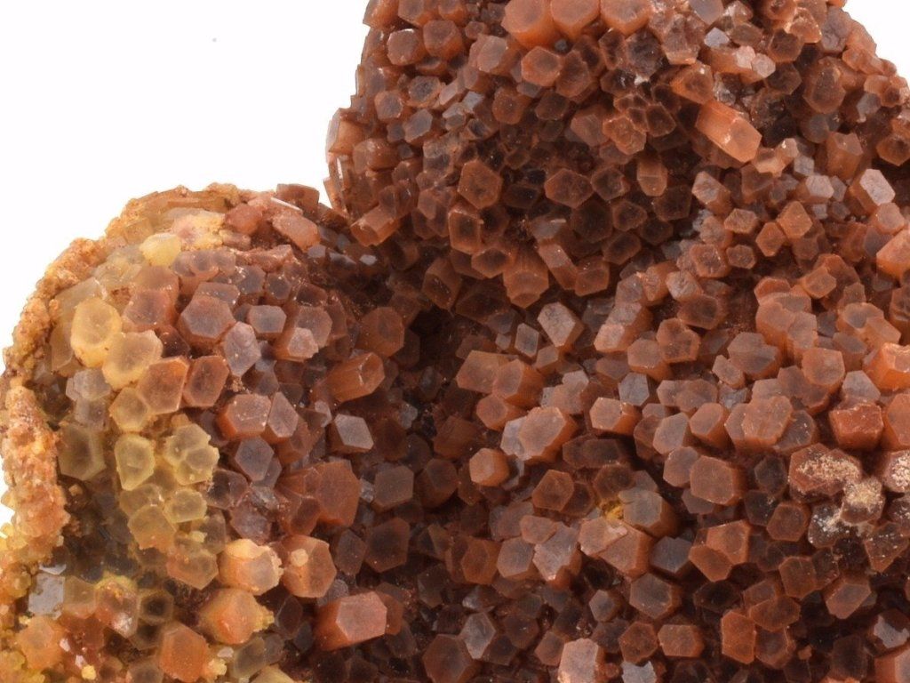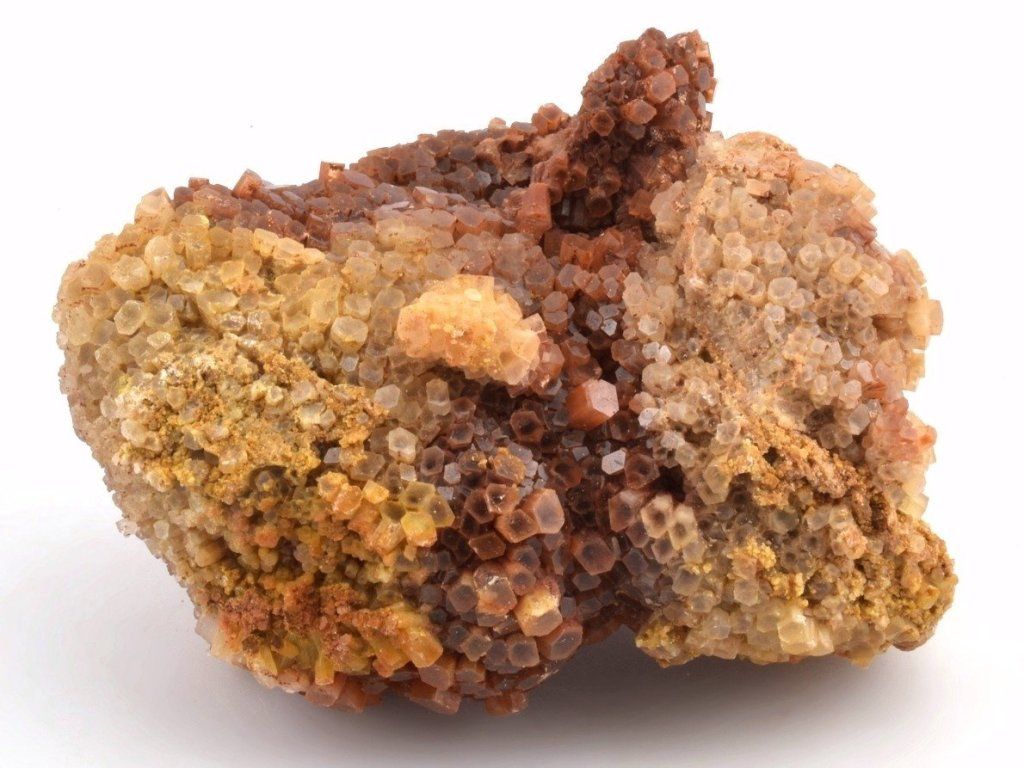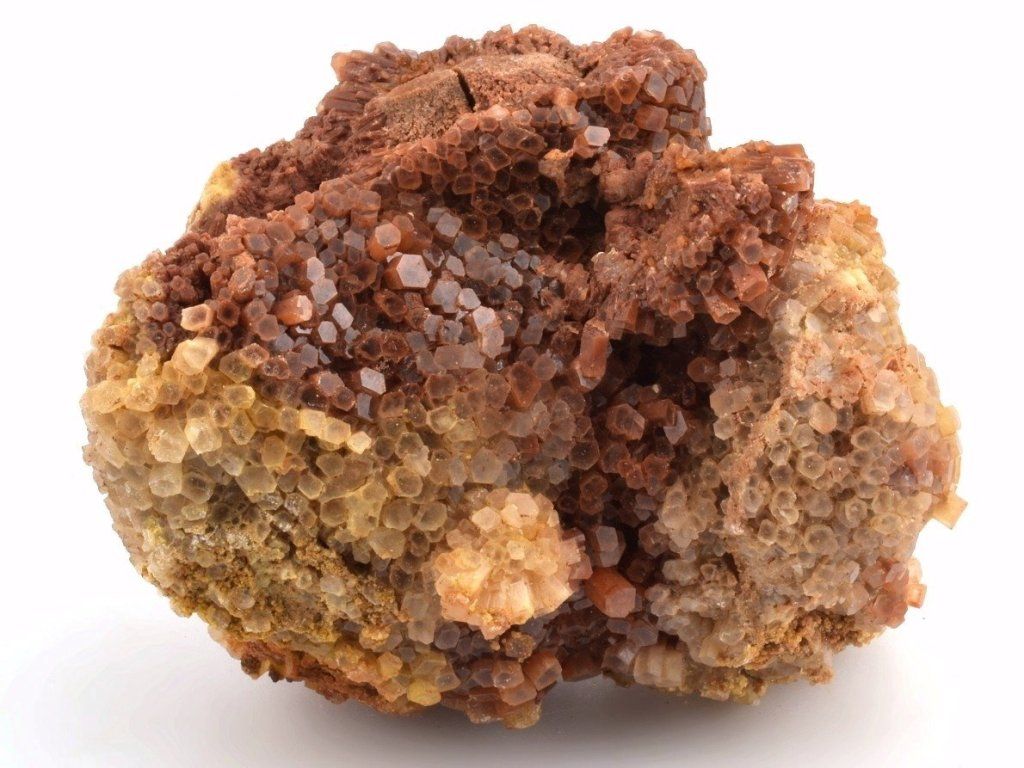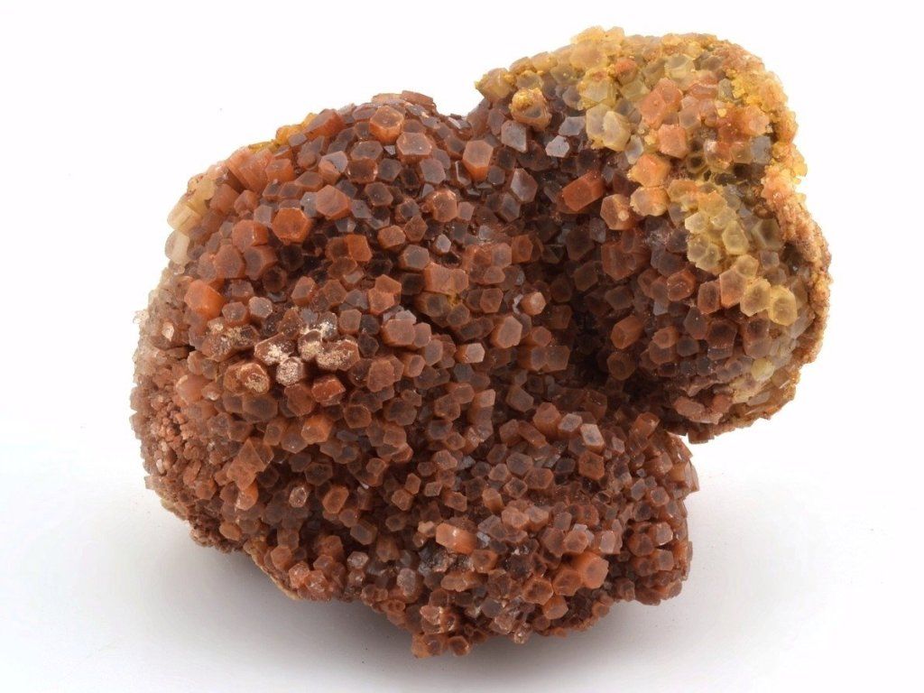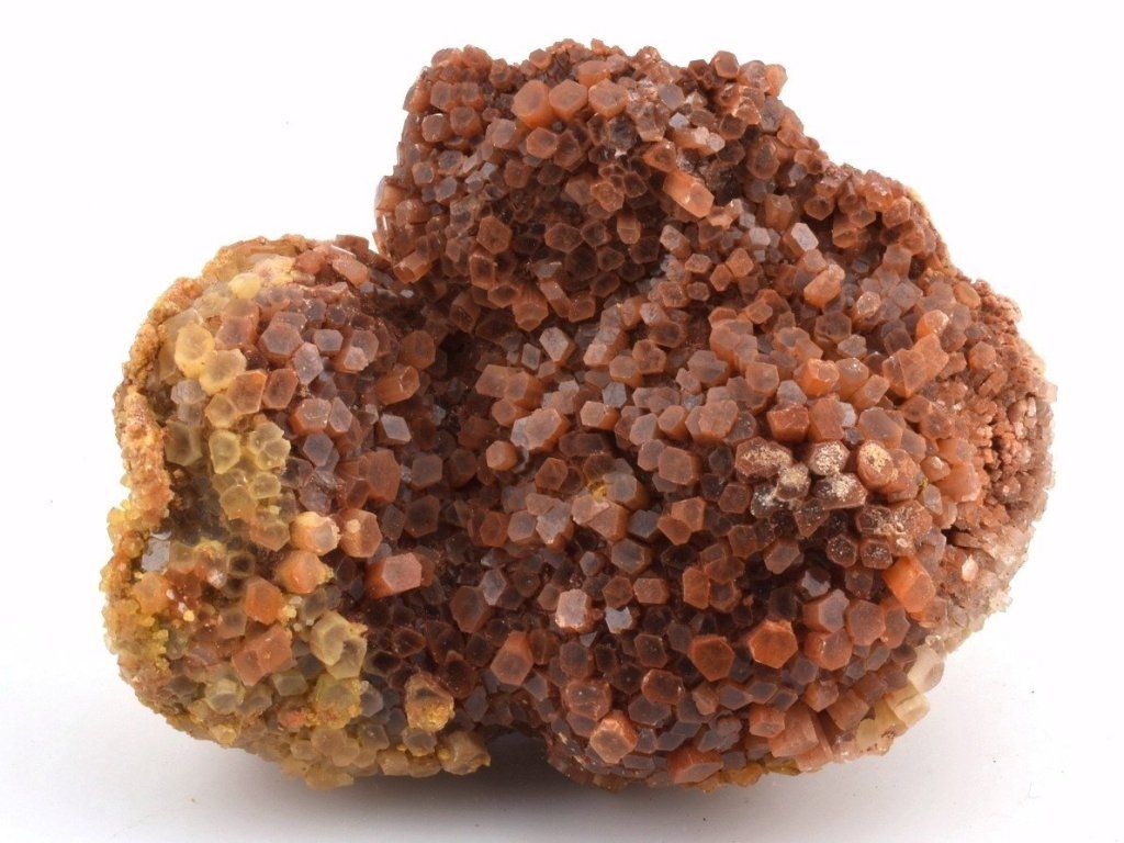 Drúza drobných sloupečkovitých krystalů aragonitu původem z Maroka. Vzorky z této lokality mají často červenohnědé zbarvení způsobené železnými inkluzemi. Na lokalitě se nacházejí také dvoubarevné, bílé, šedé nebo čiré srůsty.