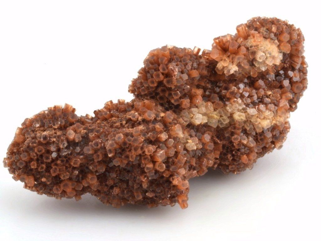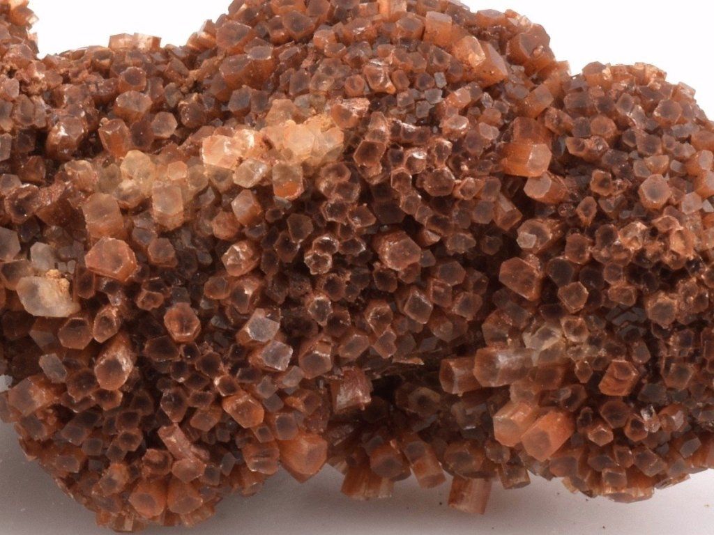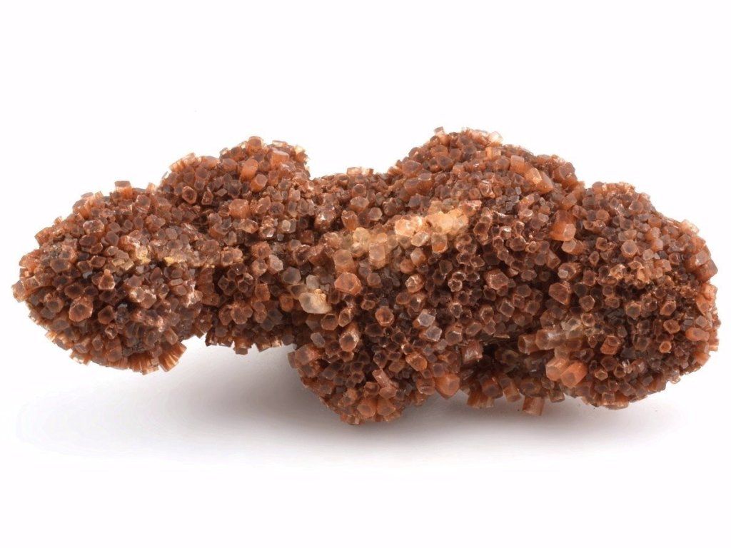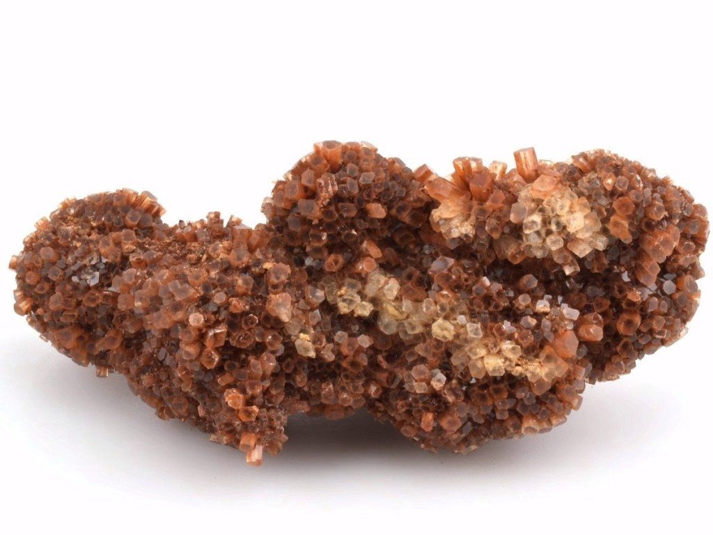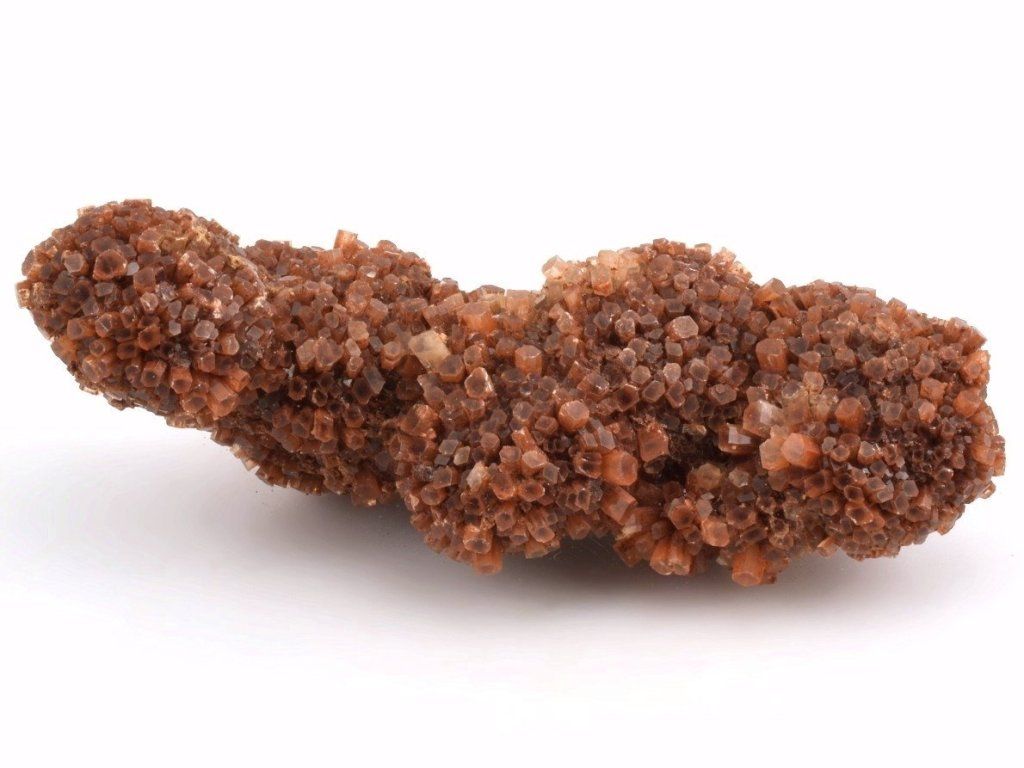 Drúza drobných sloupečkovitých krystalů aragonitu původem z Maroka. Vzorky z této lokality mají často červenohnědé zbarvení způsobené železnými inkluzemi. Na lokalitě se nacházejí také dvoubarevné, bílé, šedé nebo čiré srůsty.