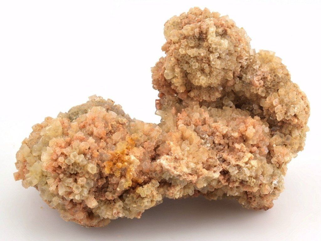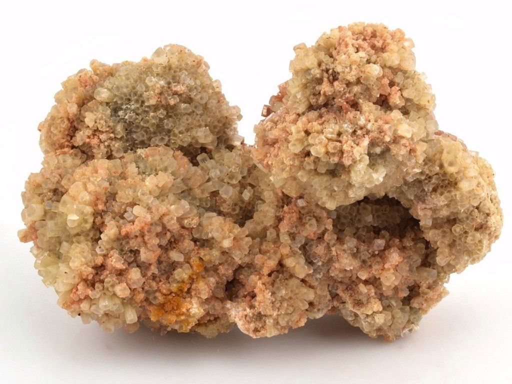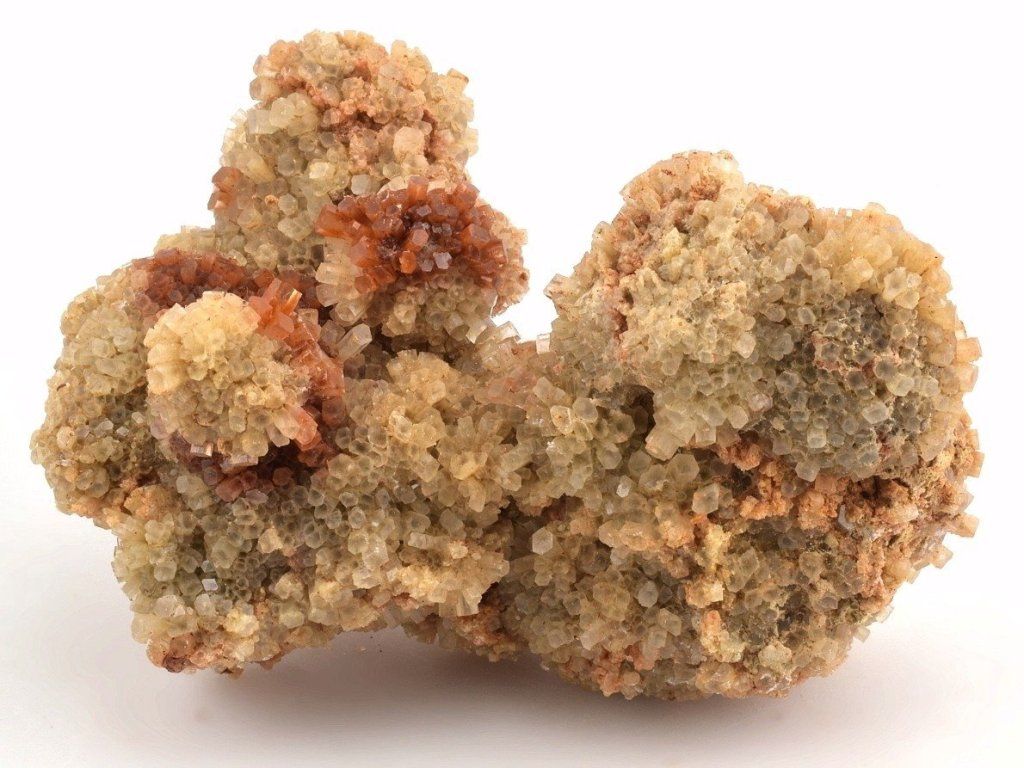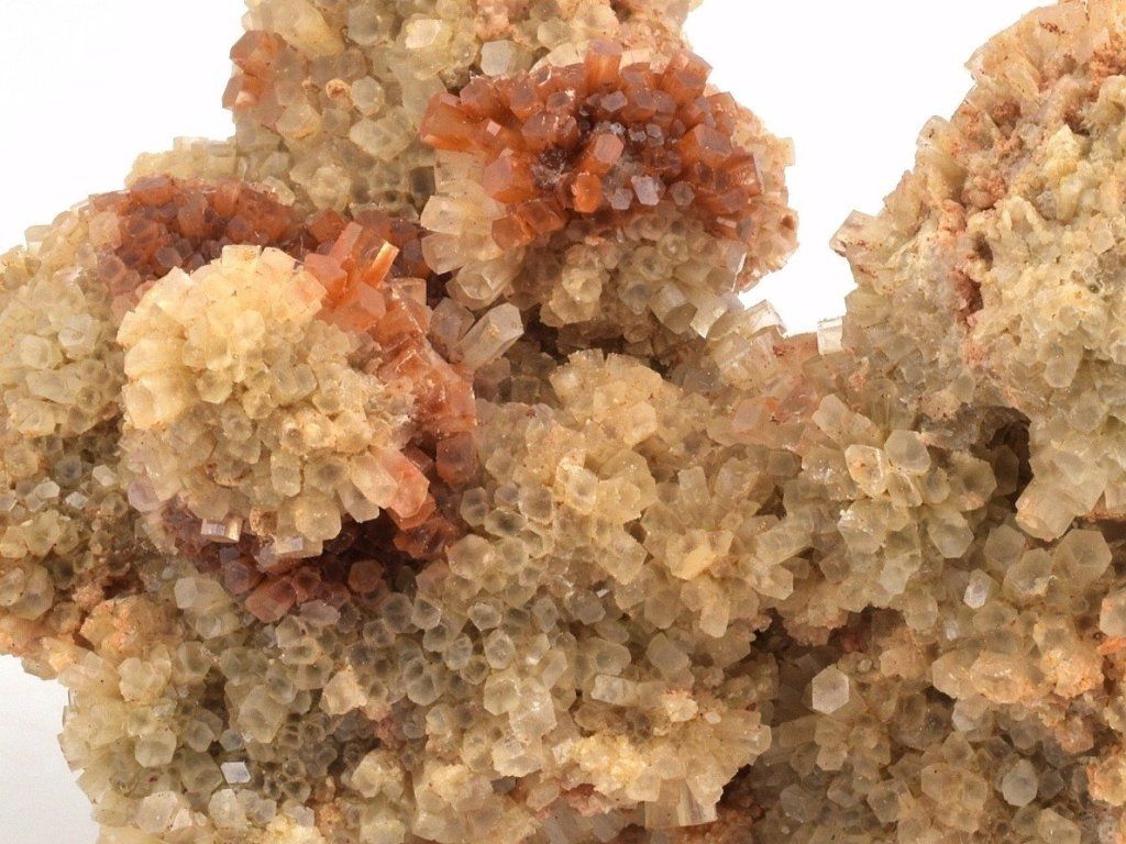 Drúza drobných sloupečkovitých krystalů aragonitu původem z Maroka. Vzorky z této lokality mají často červenohnědé zbarvení způsobené železnými inkluzemi. Na lokalitě se nacházejí také dvoubarevné, bílé, šedé nebo čiré srůsty.