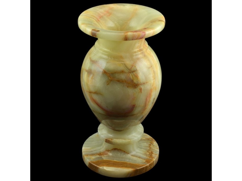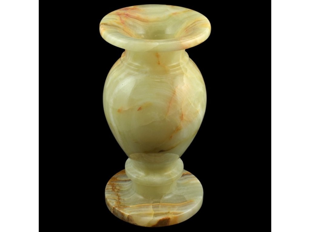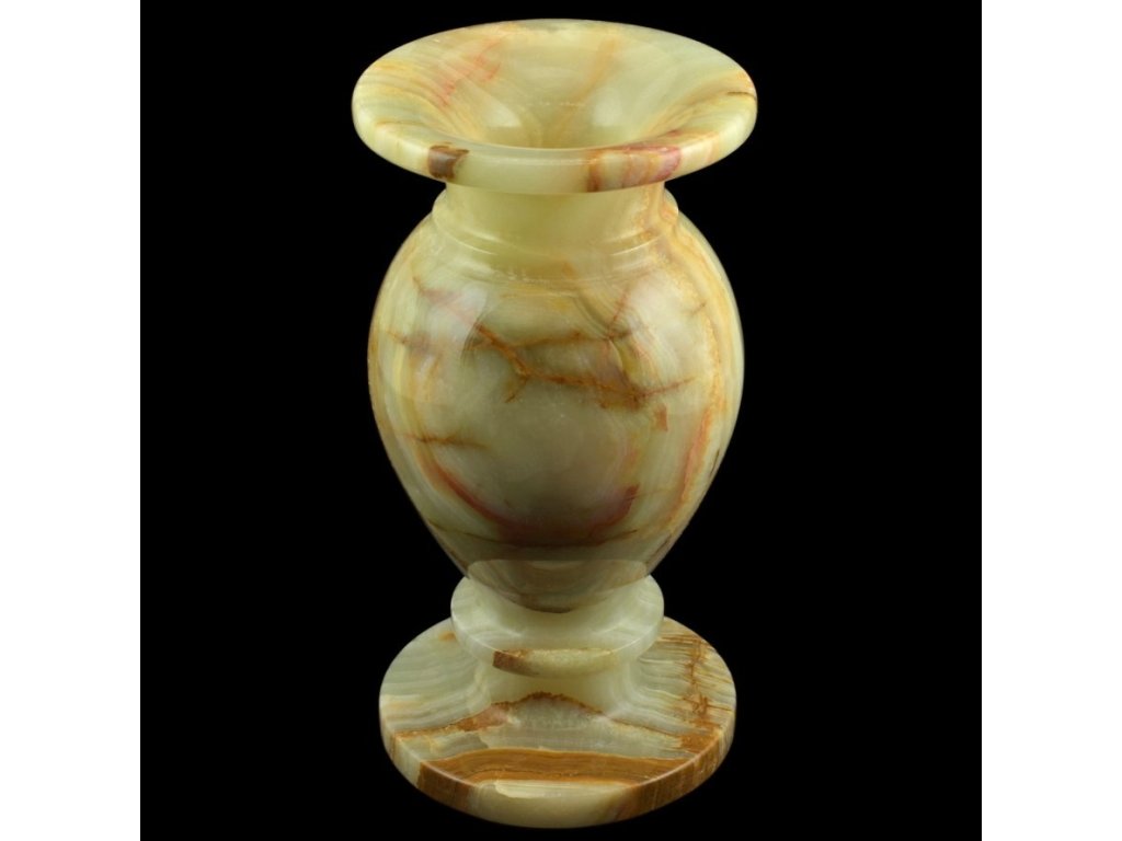 Dekorativní váza je vyrobena v Pákistánu z kvalitního aragonit-onyxového mramoru (onyx marble). Každý kus je pečlivě vyleštěn, aby vynikla přirozená kresba kamene a jeho jemný lesk.
