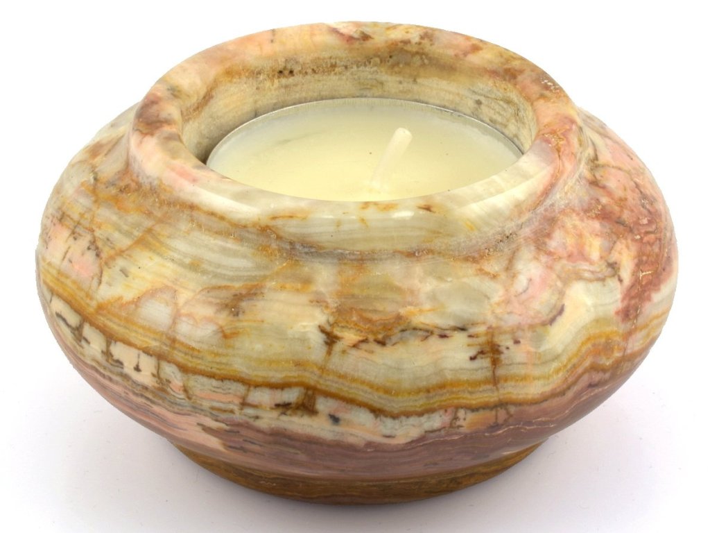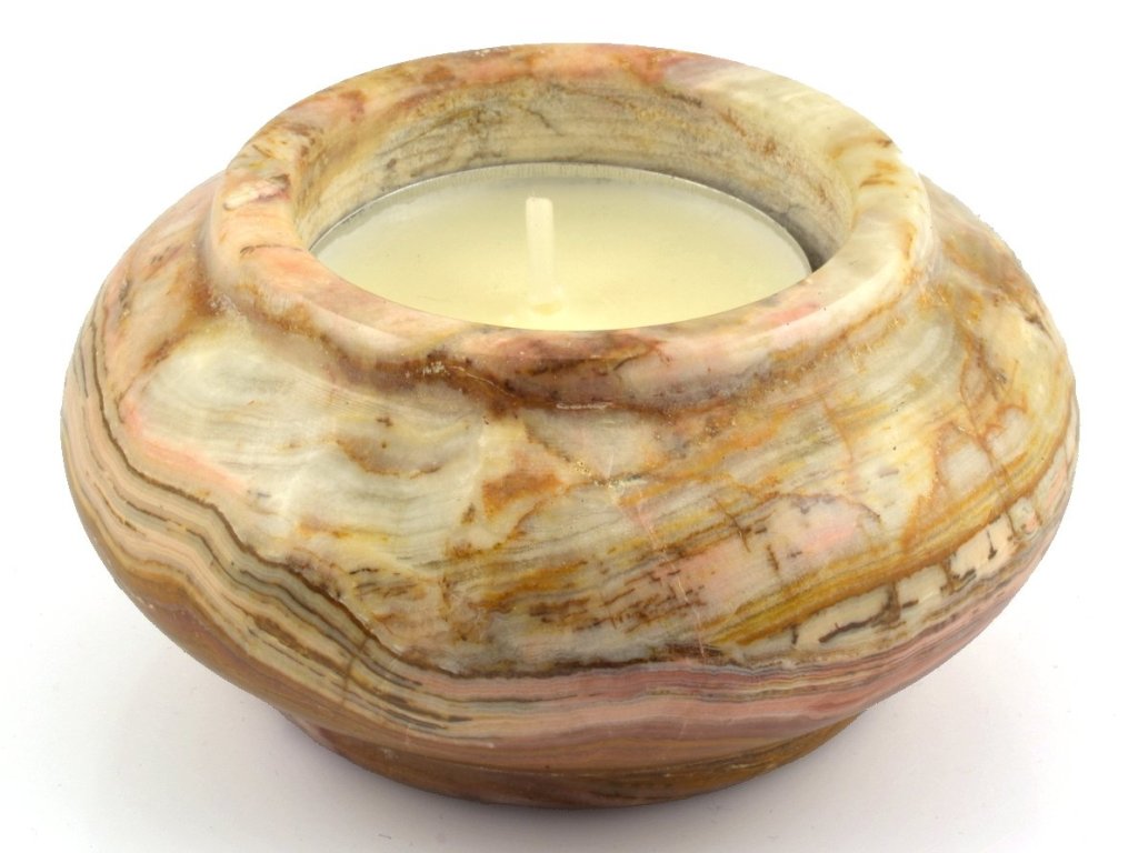 Svícen je vyroben z přírodního aragonit-onyxu, známého také jako onyxový mramor nebo pákistanský onyx. Povrch je pečlivě leštěný do vysokého lesku, který zvýrazňuje přirozenou kresbu kamene.
