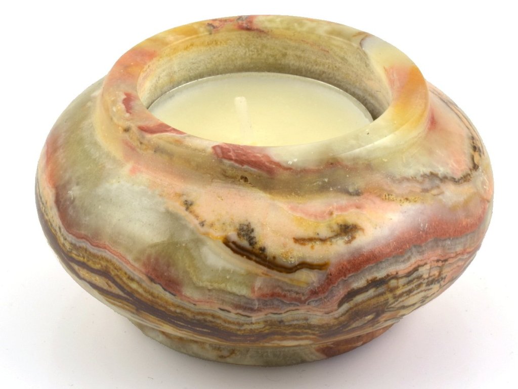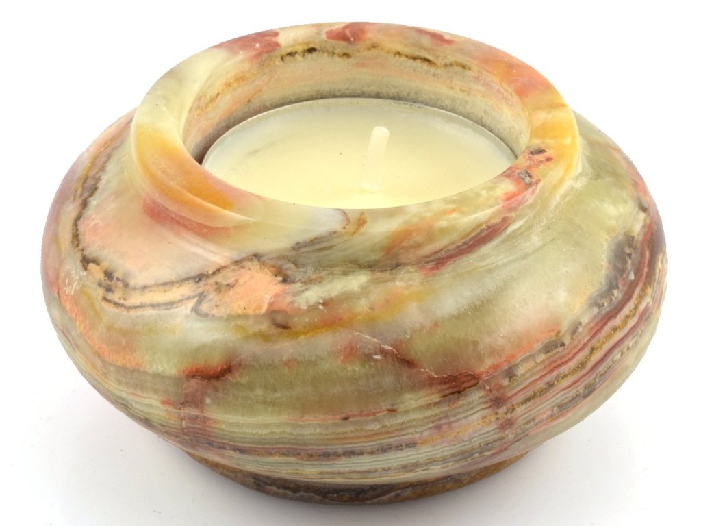 Svícen je vyroben z přírodního aragonit-onyxu, známého také jako onyxový mramor nebo pákistanský onyx. Povrch je pečlivě leštěný do vysokého lesku, který zvýrazňuje přirozenou kresbu kamene.