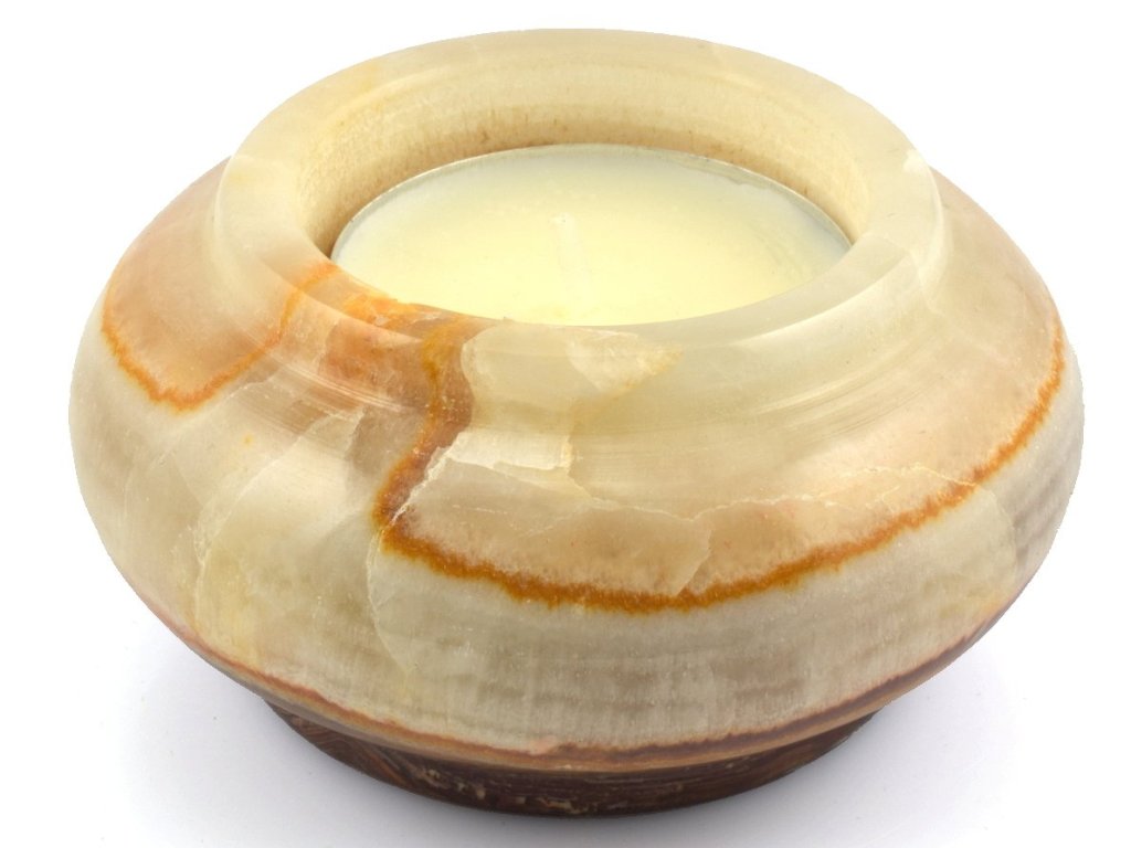 Svícen je vyroben z přírodního aragonit-onyxu, známého také jako onyxový mramor nebo pákistanský onyx. Povrch je pečlivě leštěný do vysokého lesku, který zvýrazňuje přirozenou kresbu kamene.