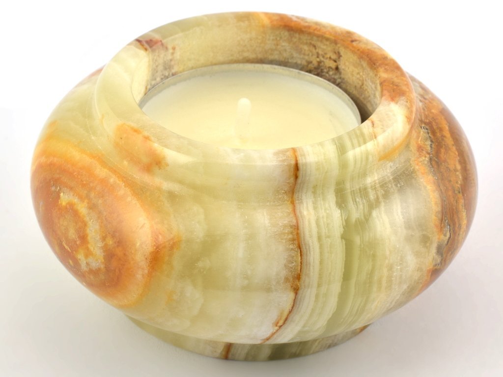 Svícen je vyroben z přírodního aragonit-onyxu, známého také jako onyxový mramor nebo pákistanský onyx. Povrch je pečlivě leštěný do vysokého lesku, který zvýrazňuje přirozenou kresbu kamene.