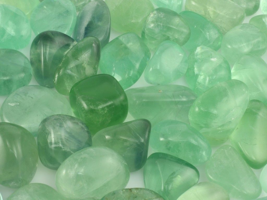 Zelený fluorit z Číny. Fluorit je minerál známý svou křehkostí, proto je třeba s těmito kameny zacházet opatrně, aby nedošlo k jejich poškození. Charakteristickým rysem u tohoto zeleného fluoritu je jeho schopnost fluoreskovat – pod ultrafialovým (UV) světlem září světle modrým odstínem.