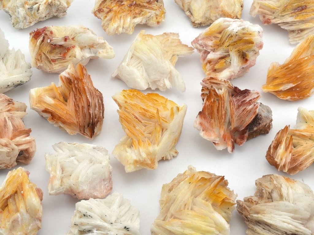 Drúzy lištovitých krystalů barytu pocházející z proslulé lokality Mibladen v marocké oblasti Drâa-Tafilalet. Typické lupenité krystaly vytvářejí esteticky působivé agregáty, které si oblíbili sběratelé minerálů po celém světě. Tyto baryty mají rozmanitou barevnou paletu, zahrnující bílou, světle okrovou, růžovou nebo červenou.