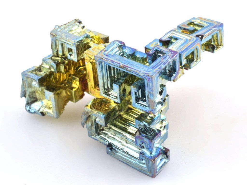 Bismut (bizmut) je fascinující prvek známý svými výraznými duhovými stupňovitými krystaly, které vznikají při řízené rekrystalizaci roztaveného bismutu a následné oxidaci povrchu. Výsledkem jsou geometricky dokonalé struktury s kovovým leskem, které působí téměř futuristicky.