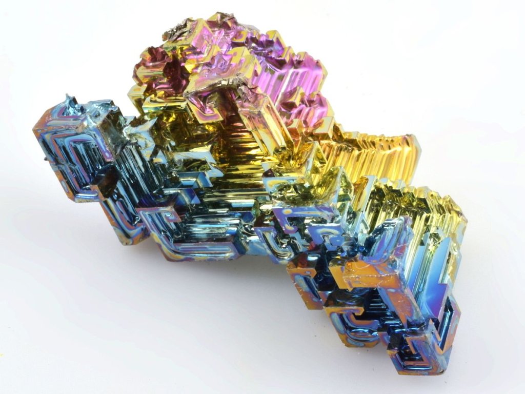 Krystal má vysokou iridescenci (hru duhovými barvami) viz foto. Jedná se o bismut (bizmut), vzácný a těžký kovový prvek o čistotě 99,99% v krásných barvách. Mezi sběrateli je oblíbený zejména díky vysoké iridescenci, kdy se na jeho zoxidovaném povrchu vytvářejí efektní duhové odstíny.