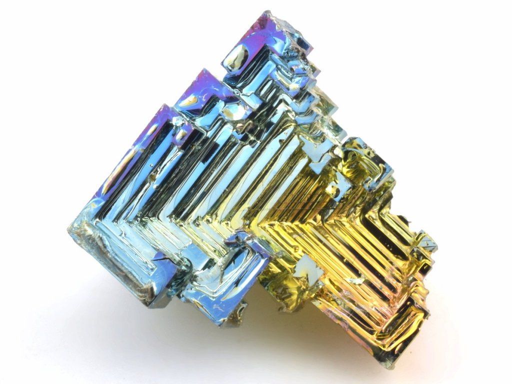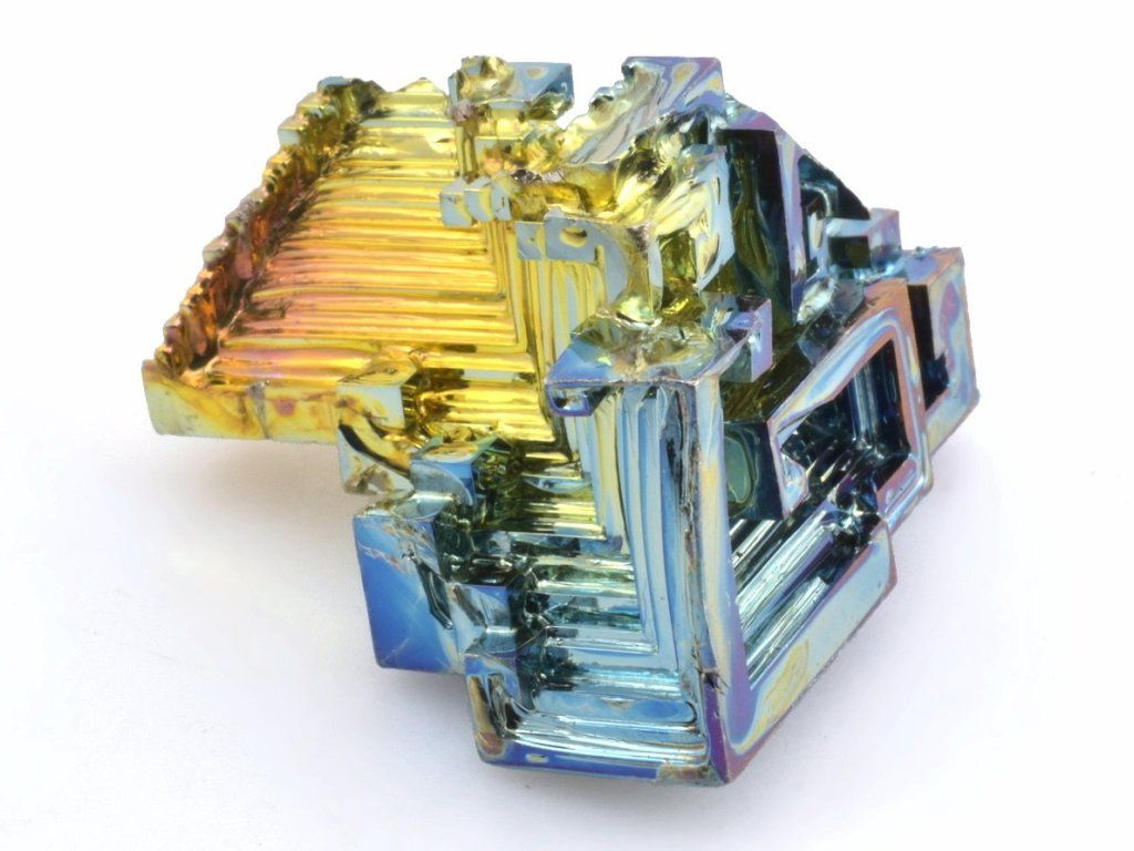 Bismut (bizmut) je fascinující prvek známý svými výraznými duhovými stupňovitými krystaly, které vznikají při řízené rekrystalizaci roztaveného bismutu a následné oxidaci povrchu. Výsledkem jsou geometricky dokonalé struktury s kovovým leskem, které působí téměř futuristicky.