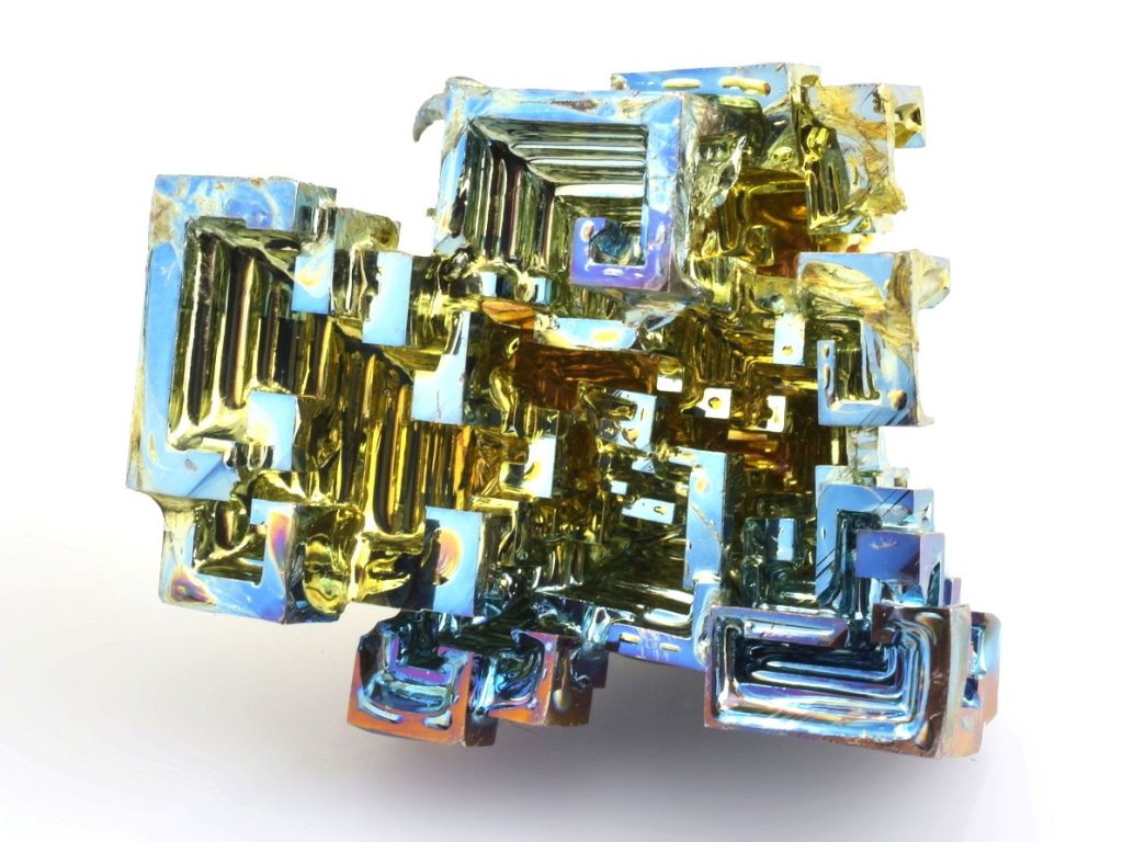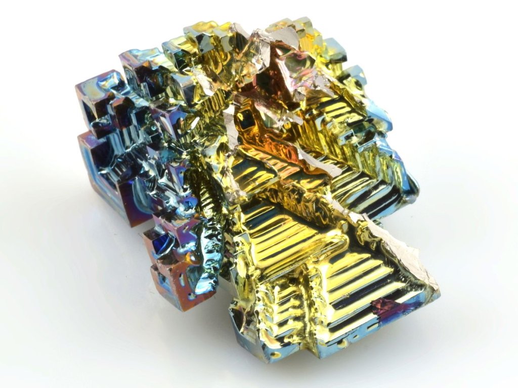 Krystal má vysokou iridescenci (hru duhovými barvami) viz foto. Jedná se o bismut (bizmut), vzácný a těžký kovový prvek o čistotě 99,99% v krásných barvách. Mezi sběrateli je oblíbený zejména díky vysoké iridescenci, kdy se na jeho zoxidovaném povrchu vytvářejí efektní duhové odstíny.