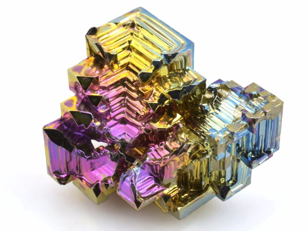 Bismut (bizmut) je fascinující prvek známý svými výraznými duhovými stupňovitými krystaly, které vznikají při řízené rekrystalizaci roztaveného bismutu a následné oxidaci povrchu. Výsledkem jsou geometricky dokonalé struktury s kovovým leskem, které působí téměř futuristicky.