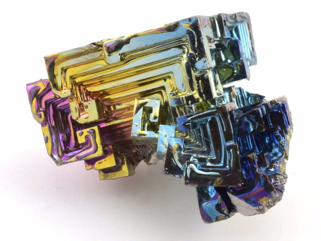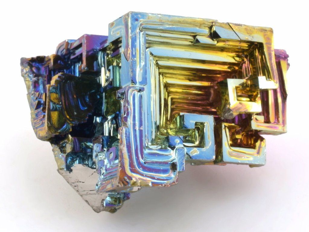 Bismut (bizmut) je fascinující prvek známý svými výraznými duhovými stupňovitými krystaly, které vznikají při řízené rekrystalizaci roztaveného bismutu a následné oxidaci povrchu. Výsledkem jsou geometricky dokonalé struktury s kovovým leskem, které působí téměř futuristicky.