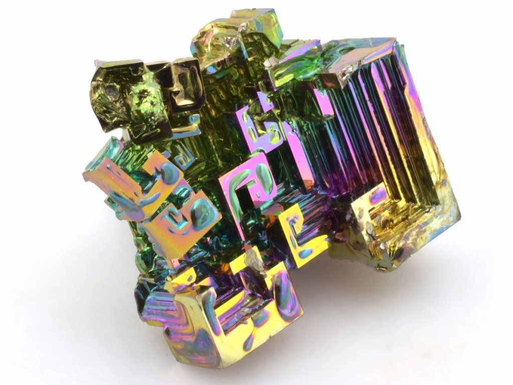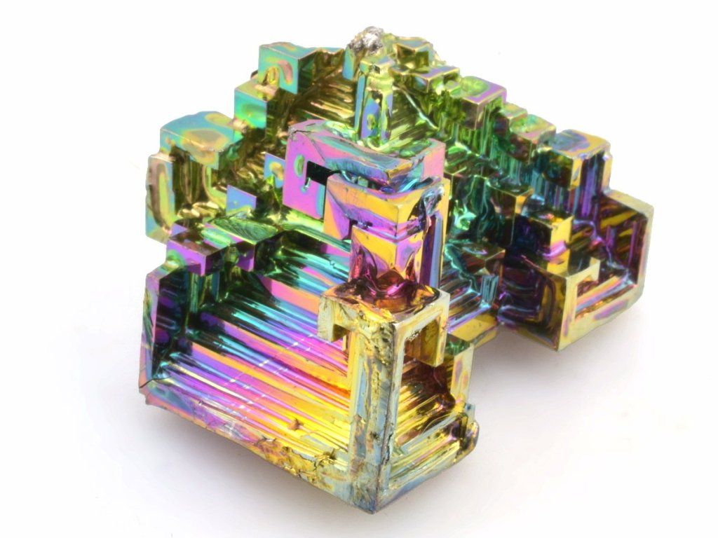 Bismut (bizmut) je fascinující prvek známý svými výraznými duhovými stupňovitými krystaly, které vznikají při řízené rekrystalizaci roztaveného bismutu a následné oxidaci povrchu. Výsledkem jsou geometricky dokonalé struktury s kovovým leskem, které působí téměř futuristicky.