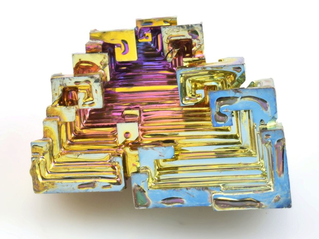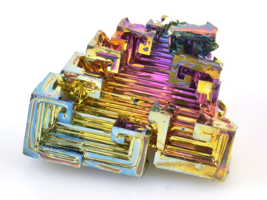 Krystal má vysokou iridescenci (hru duhovými barvami) viz foto. Jedná se o bismut (bizmut), vzácný a těžký kovový prvek o čistotě 99,99% v krásných barvách. Mezi sběrateli je oblíbený zejména díky vysoké iridescenci, kdy se na jeho zoxidovaném povrchu vytvářejí efektní duhové odstíny.