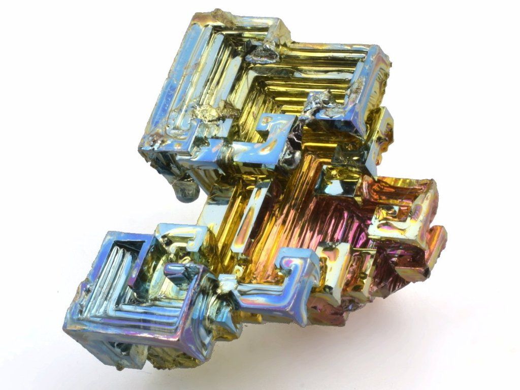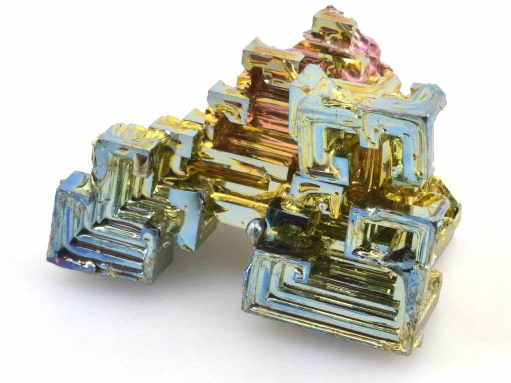 Bismut (bizmut) je fascinující prvek známý svými výraznými duhovými stupňovitými krystaly, které vznikají při řízené rekrystalizaci roztaveného bismutu a následné oxidaci povrchu. Výsledkem jsou geometricky dokonalé struktury s kovovým leskem, které působí téměř futuristicky.