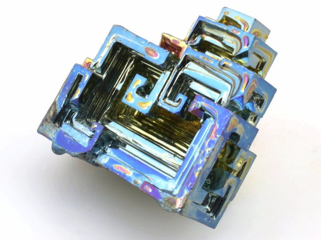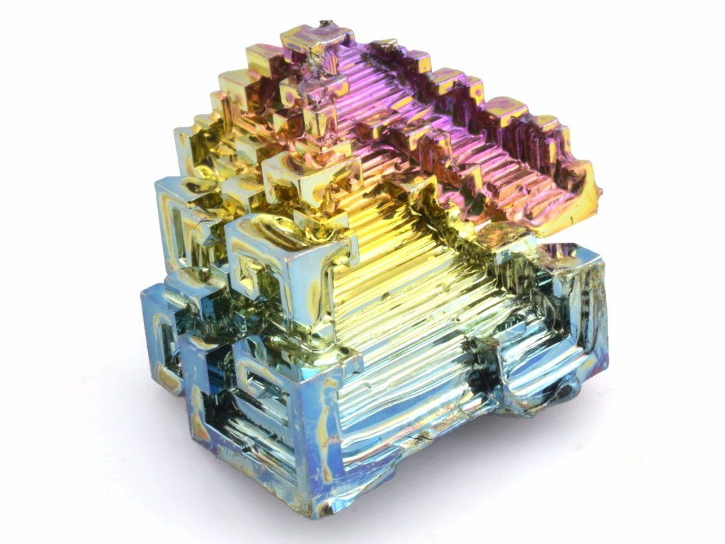 Bismut (bizmut) je fascinující prvek známý svými výraznými duhovými stupňovitými krystaly, které vznikají při řízené rekrystalizaci roztaveného bismutu a následné oxidaci povrchu. Výsledkem jsou geometricky dokonalé struktury s kovovým leskem, které působí téměř futuristicky.