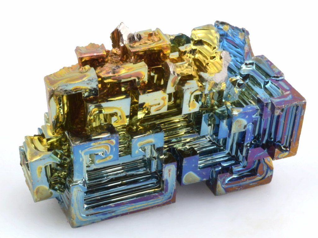 Bismut (bizmut) je fascinující prvek známý svými výraznými duhovými stupňovitými krystaly, které vznikají při řízené rekrystalizaci roztaveného bismutu a následné oxidaci povrchu. Výsledkem jsou geometricky dokonalé struktury s kovovým leskem, které působí téměř futuristicky.