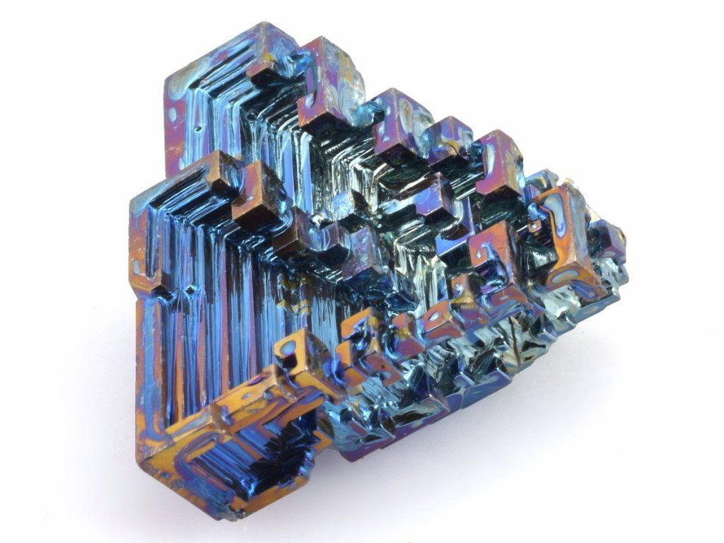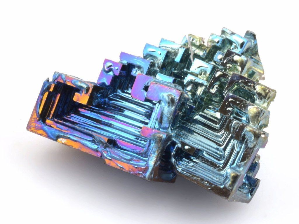 Bismut (bizmut) je fascinující prvek známý svými výraznými duhovými stupňovitými krystaly, které vznikají při řízené rekrystalizaci roztaveného bismutu a následné oxidaci povrchu. Výsledkem jsou geometricky dokonalé struktury s kovovým leskem, které působí téměř futuristicky.