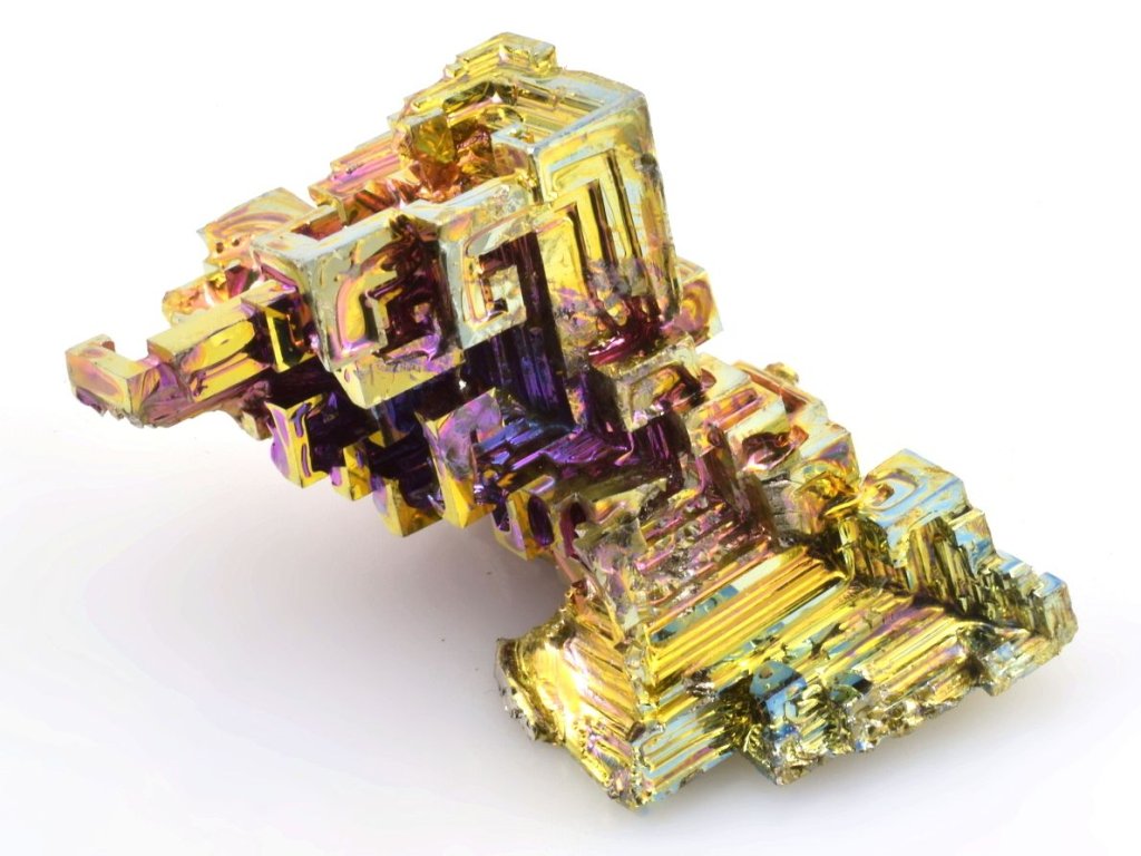 Krystal má vysokou iridescenci (hru duhovými barvami) viz foto. Jedná se o bismut (bizmut), vzácný a těžký kovový prvek o čistotě 99,99% v krásných barvách. Mezi sběrateli je oblíbený zejména díky vysoké iridescenci, kdy se na jeho zoxidovaném povrchu vytvářejí efektní duhové odstíny.