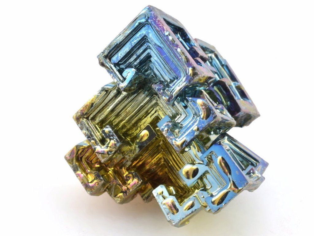 Bismut (bizmut) je fascinující prvek známý svými výraznými duhovými stupňovitými krystaly, které vznikají při řízené rekrystalizaci roztaveného bismutu a následné oxidaci povrchu. Výsledkem jsou geometricky dokonalé struktury s kovovým leskem, které působí téměř futuristicky.