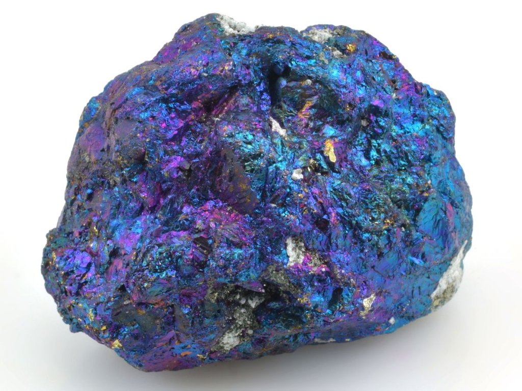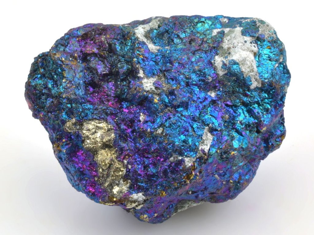 Pěkná ukázka minerálu bornit (paví ruda) s vysokou iridiscencí (hra duhovými barvami), která vzniká zvětráváním jeho povrchu.