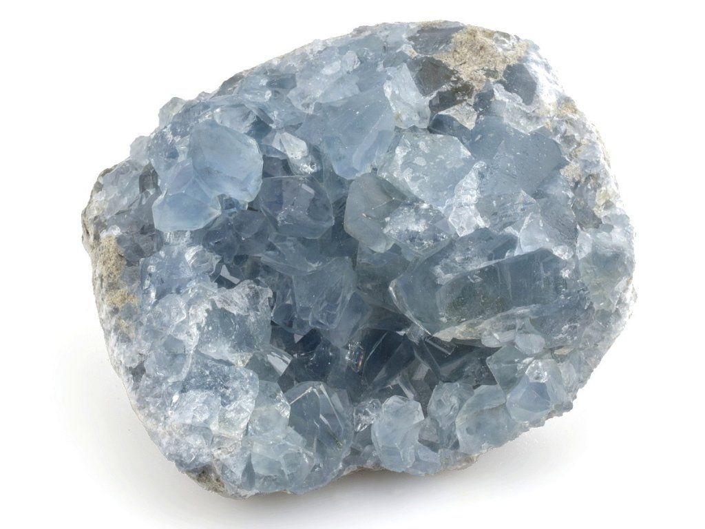 Pravý přírodní celestin – drúza světle modrých, lesklých krystalů celestinu, původem z Madagaskaru.