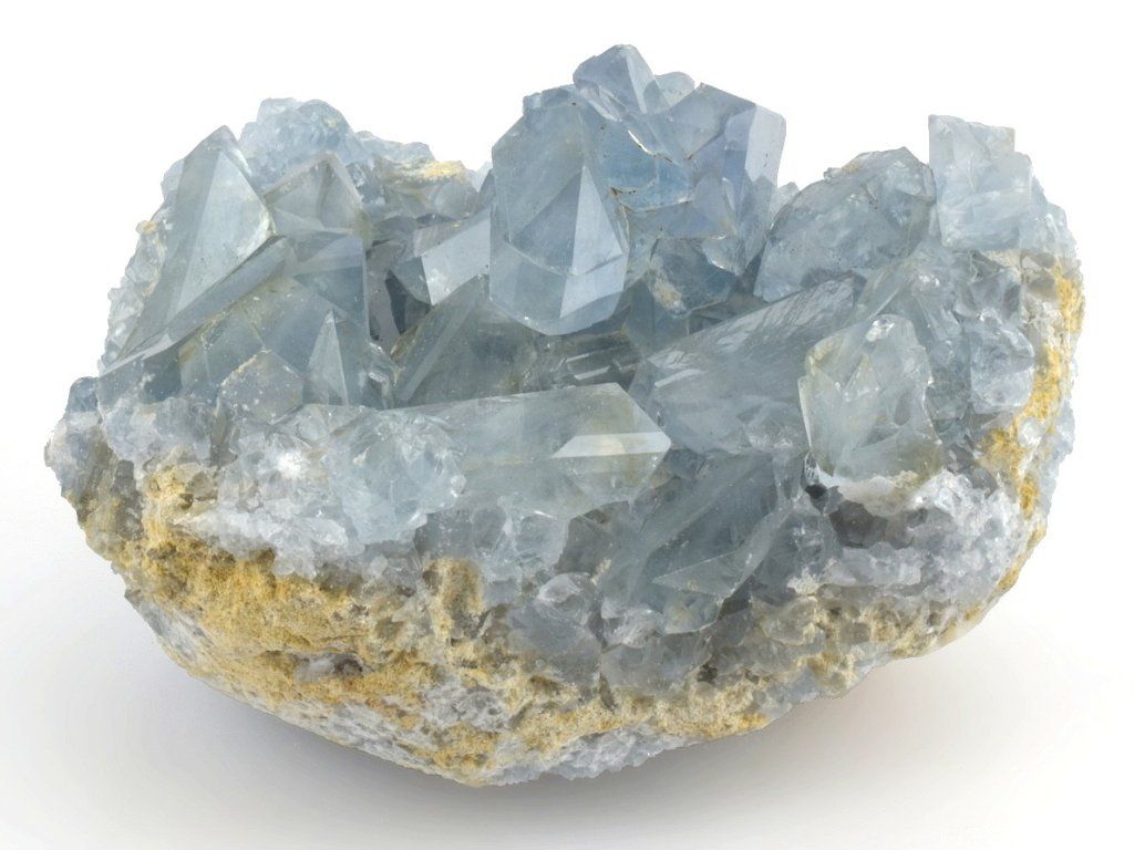 Pravý přírodní celestin – drúza světle modrých, lesklých krystalů celestinu, původem z Madagaskaru.