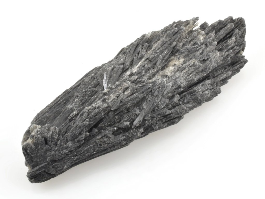 Sbírkový kus černého kyanitu pocházející z proslulé lokality. Tento estetický minerál tvoří vějířovitý shluk složený z desítek krystalů. Krystaly se vyznačují jemným voskovým leskem. Vzorek kyanitu je oboustranný. Své charakteristické černé zbarvení získává kyanit díky množství jemných inkluzí grafitu. V Brazílii se mu přezdívá „Vassoura de Bruxa“ – čarodějnické koště.