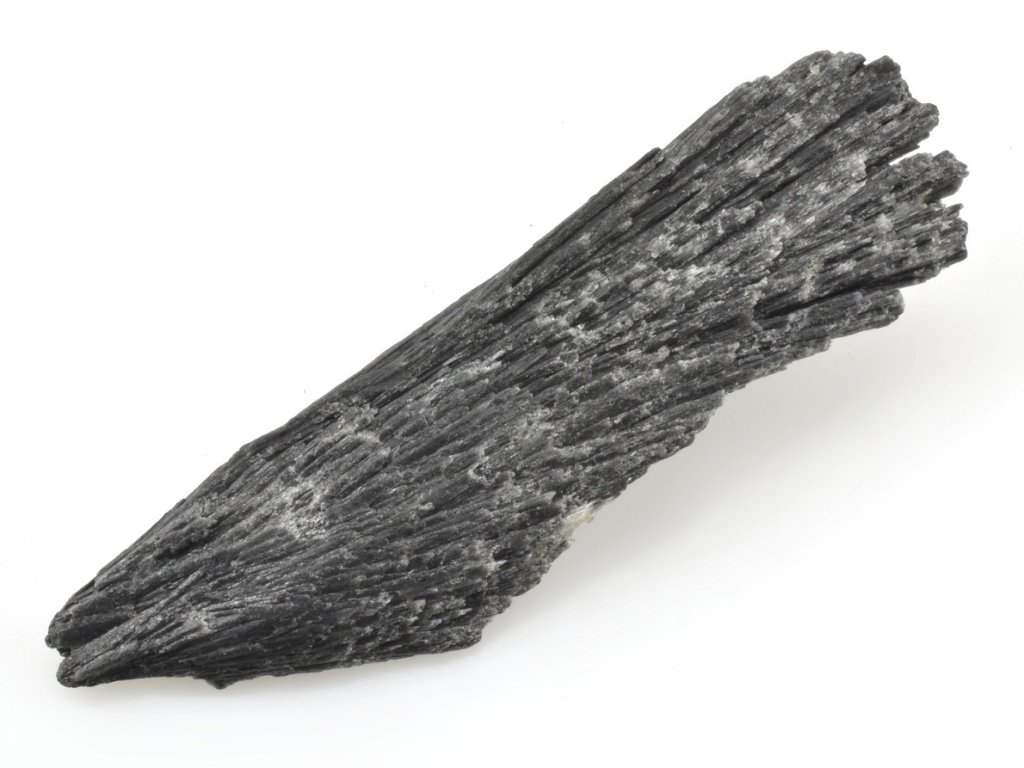 Sbírkový kus černého kyanitu pocházející z proslulé lokality. Tento estetický minerál tvoří vějířovitý shluk složený z desítek krystalů. Krystaly se vyznačují jemným voskovým leskem. Vzorek kyanitu je oboustranný. Své charakteristické černé zbarvení získává kyanit díky množství jemných inkluzí grafitu. V Brazílii se mu přezdívá „Vassoura de Bruxa“ – čarodějnické koště.