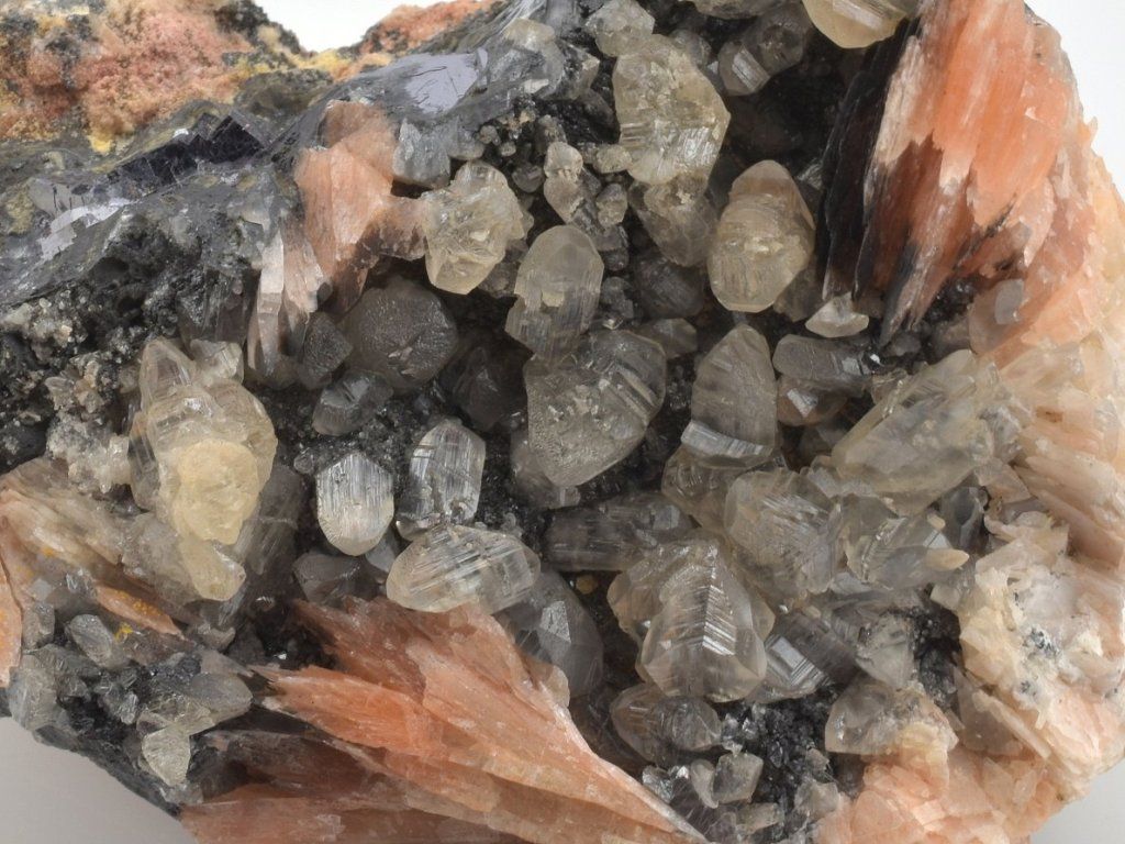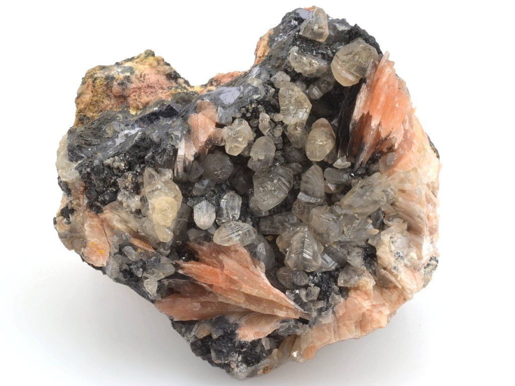 Bohatá drúza světlých krystalů cerusitu narůstajících na šedočerném galenitu, doplněná estetickými lupenitými krystaly barytu v jemných růžovo-oranžových odstínech.