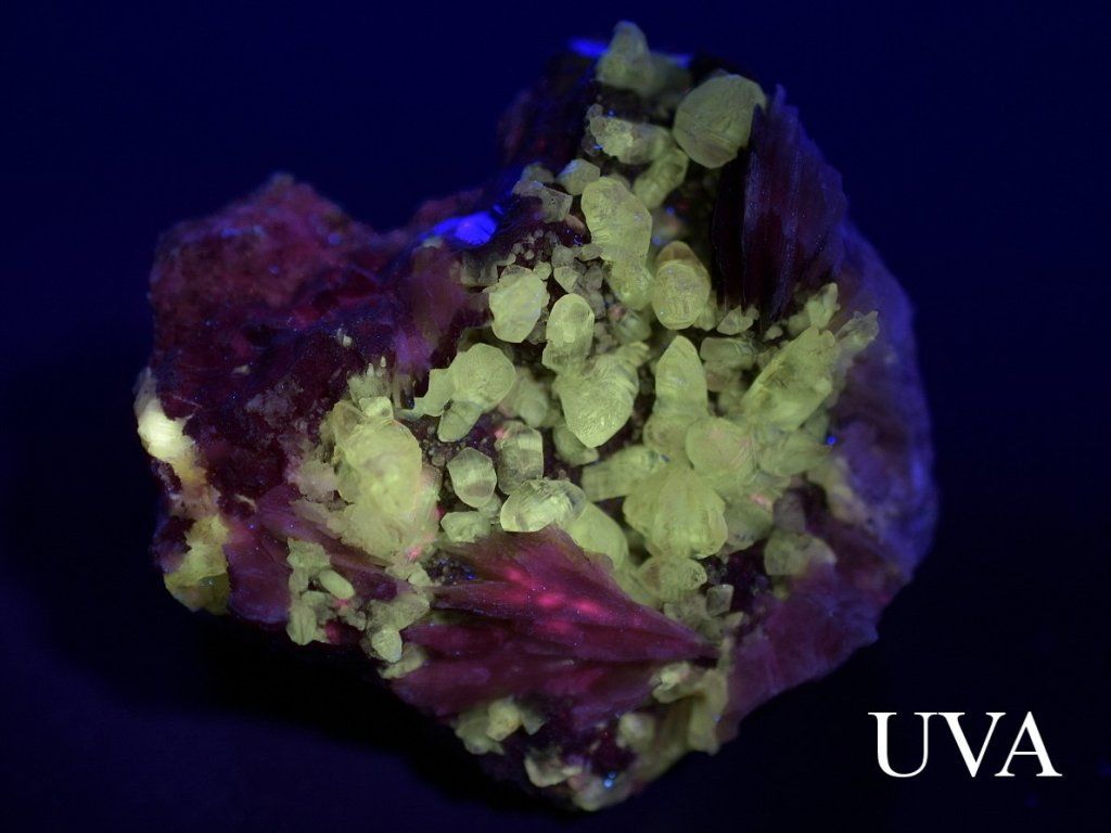 Na fotografii označené UVA je minerál nasvícen dlouhovlnným ultrafialovým světlem a jsou zde patrné následující efekty: