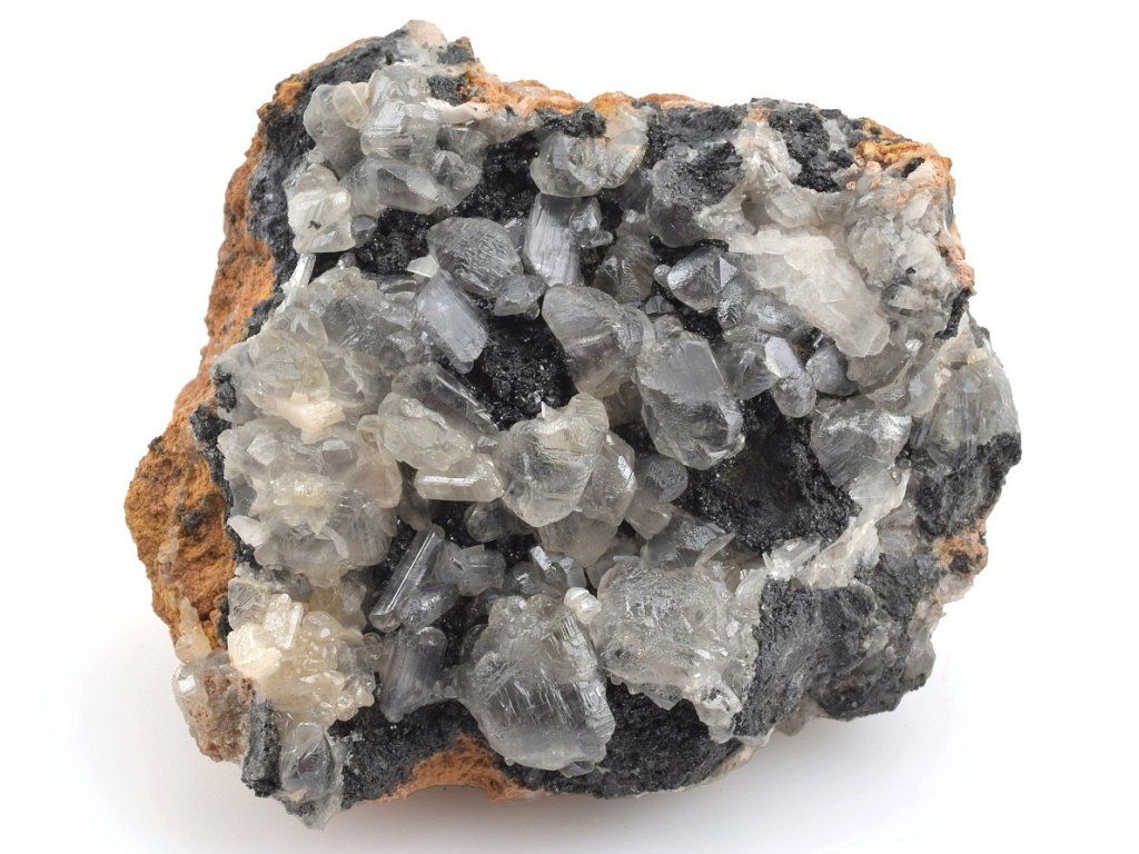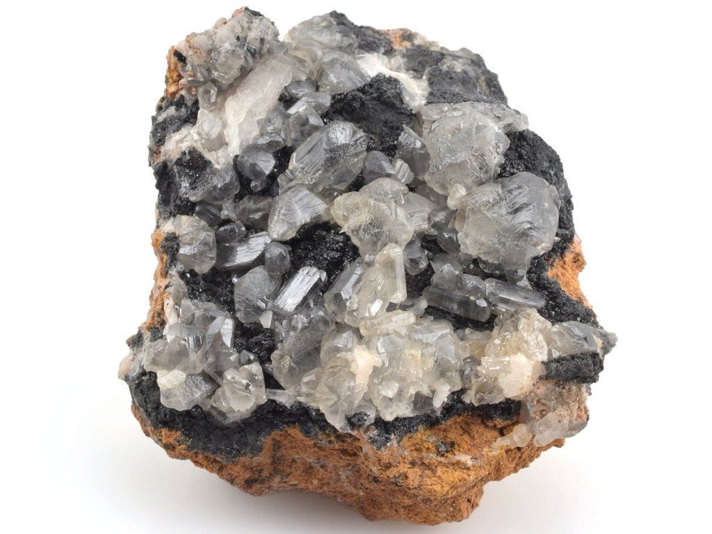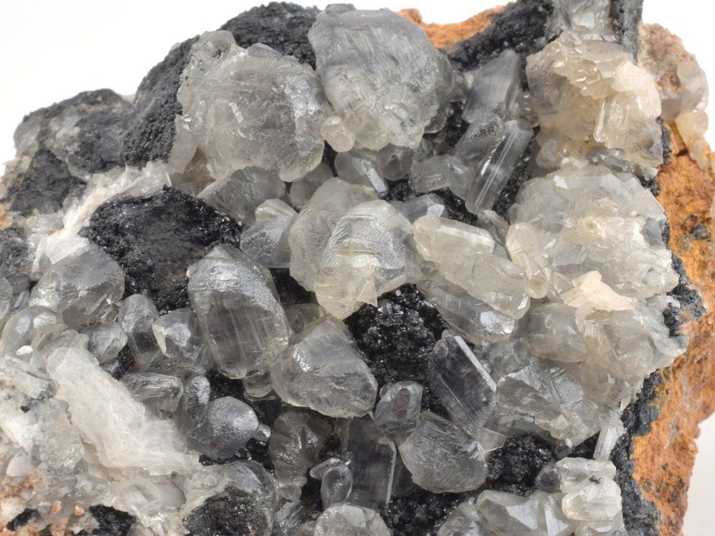 Světlé krystaly cerusitu narůstajících na šedočerném galenitu.