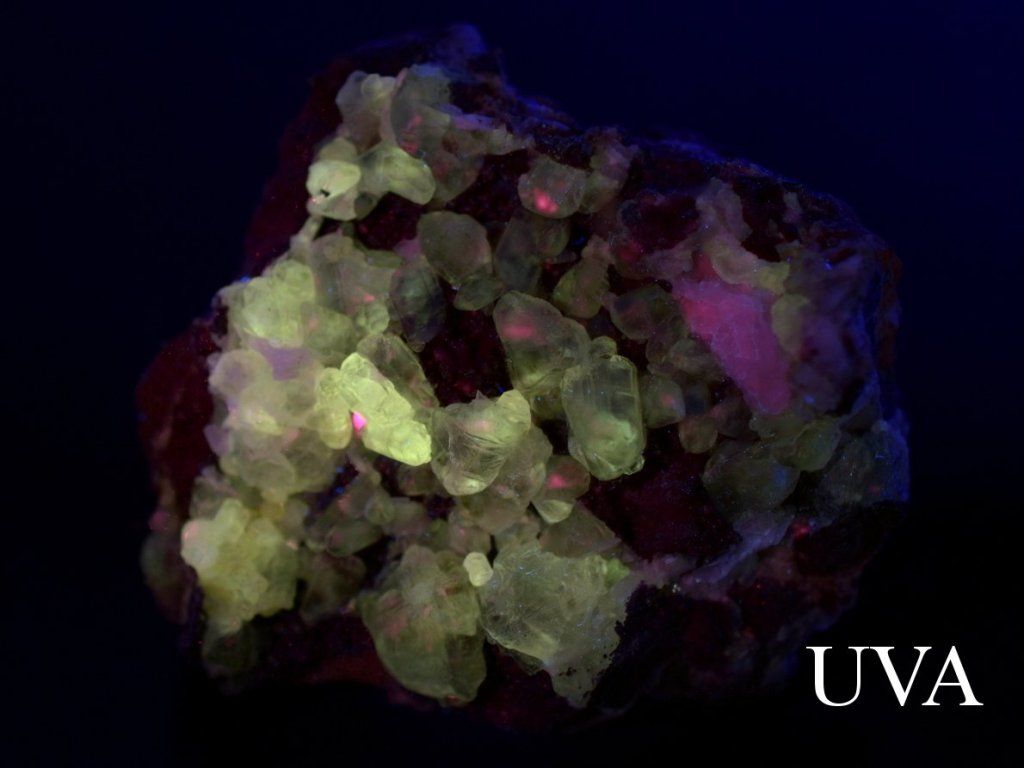 Na fotografii označené UVA je minerál nasvícen dlouhovlnným ultrafialovým světlem a jsou zde patrné následující efekty: