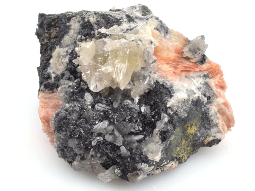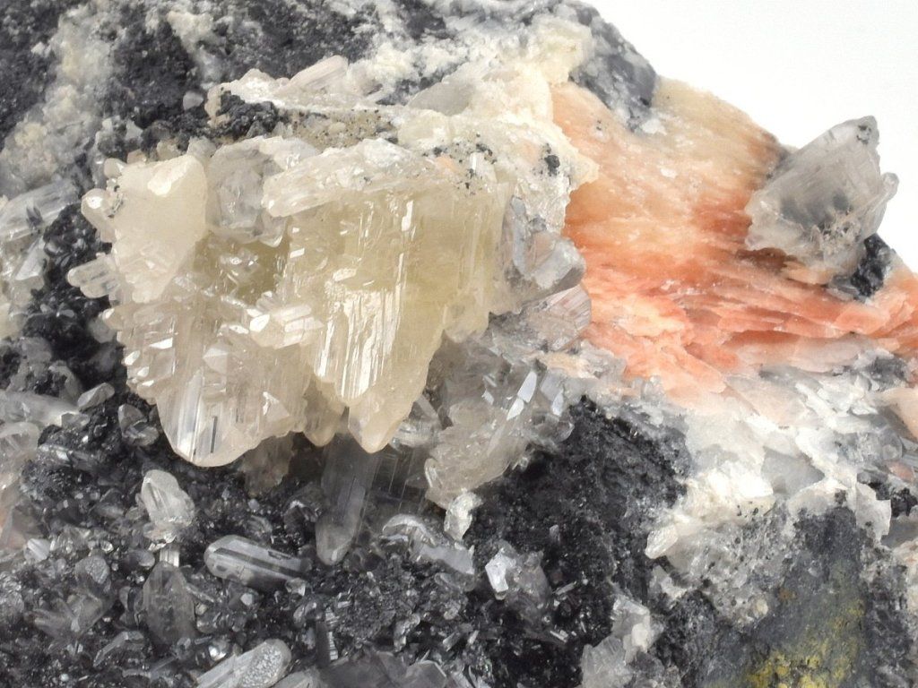 Bohatá drúza světlých krystalů cerusitu narůstajících na šedočerném galenitu, doplněná estetickými lupenitými krystaly barytu v jemných růžovo-oranžových odstínech.