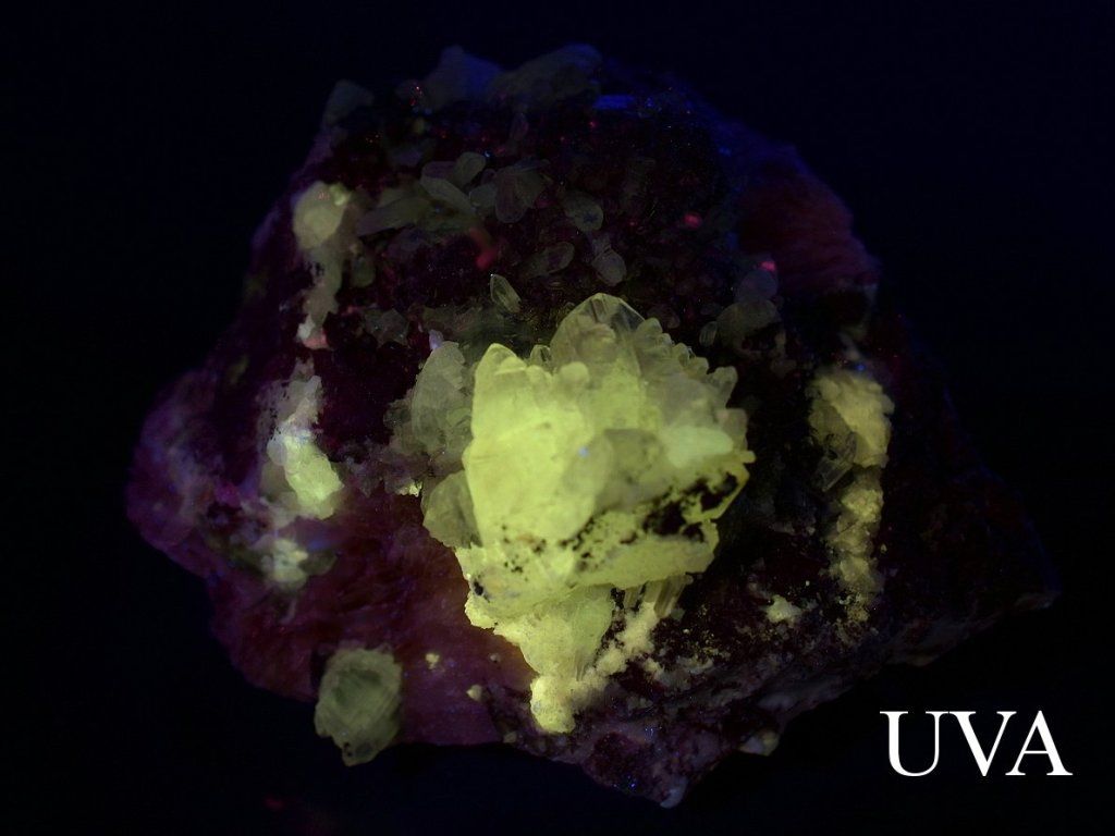 Na fotografii označené UVA je minerál nasvícen dlouhovlnným ultrafialovým světlem a jsou zde patrné následující efekty: