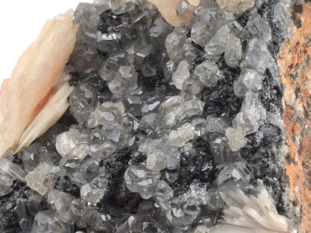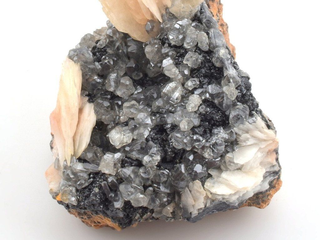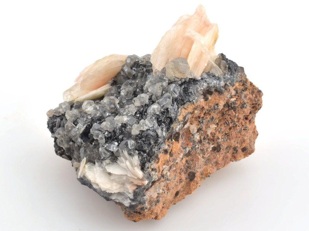 Světlé krystaly cerusitu narůstajících na šedočerném galenitu, doplněná estetickými lupenitými krystaly barytu v jemných růžovo-oranžových odstínech.