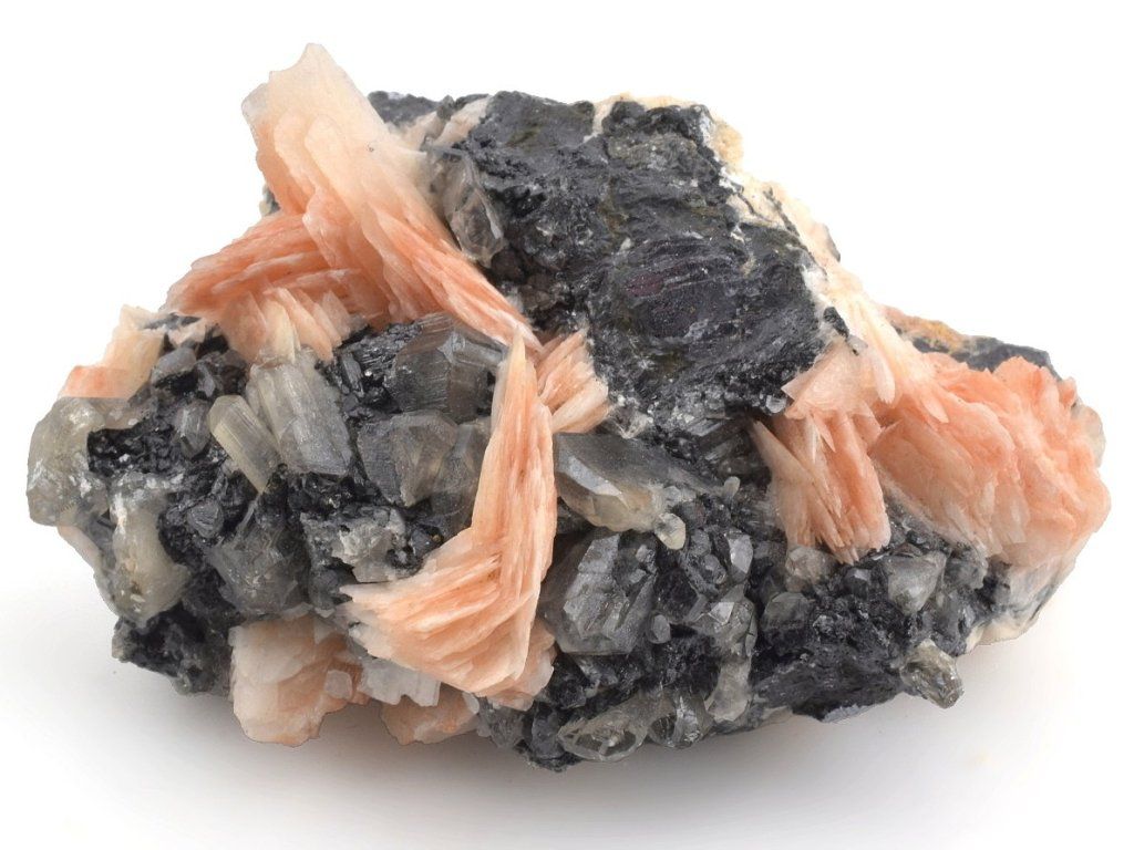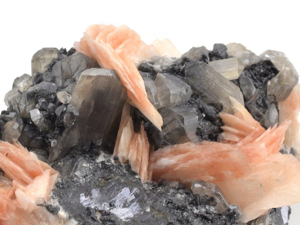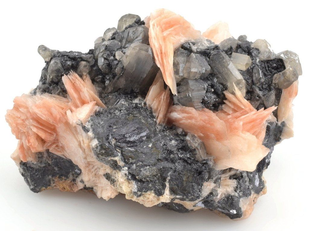 Bohatá drúza světlých krystalů cerusitu narůstajících na šedočerném galenitu, doplněná estetickými lupenitými krystaly barytu v jemných růžovo-oranžových odstínech.