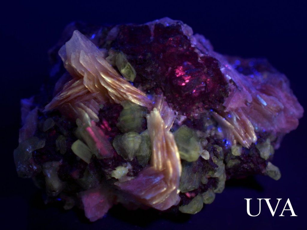 Na fotografii označené UVA je minerál nasvícen dlouhovlnným ultrafialovým světlem a jsou zde patrné následující efekty: