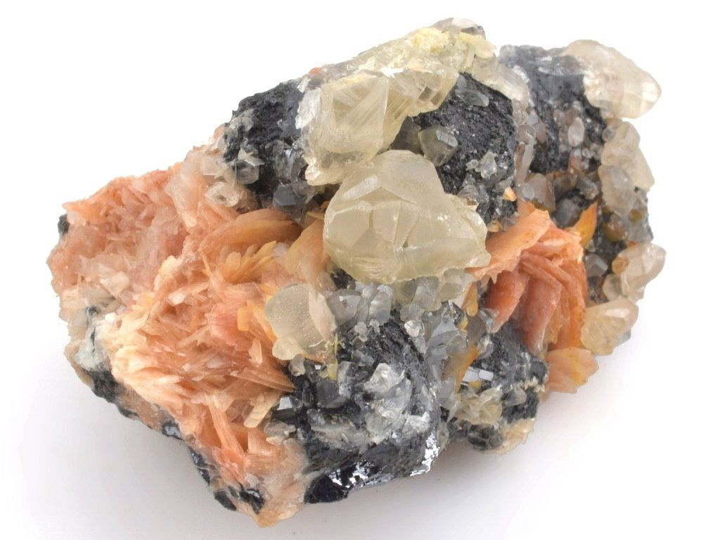 Světlé krystaly cerusitu narůstajících na šedočerném galenitu, doplněná lupenitými krystaly barytu v jemných růžovo-oranžových odstínech.