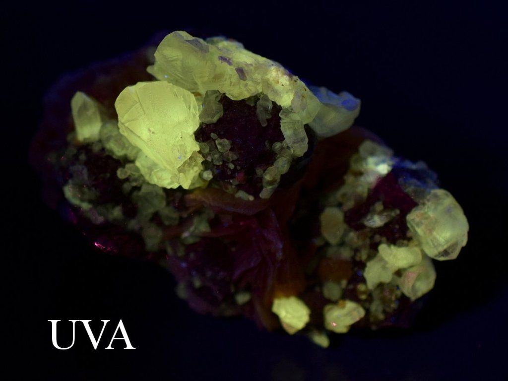 Na fotografii označené UVA je minerál nasvícen dlouhovlnným ultrafialovým světlem a jsou zde patrné následující efekty: