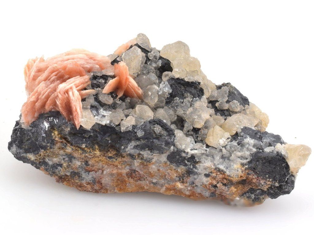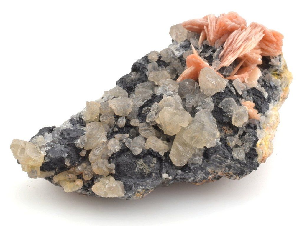 Světlé krystaly cerusitu narůstajících na šedočerném galenitu, doplněná lupenitými krystaly barytu v jemných růžovo-oranžových odstínech.