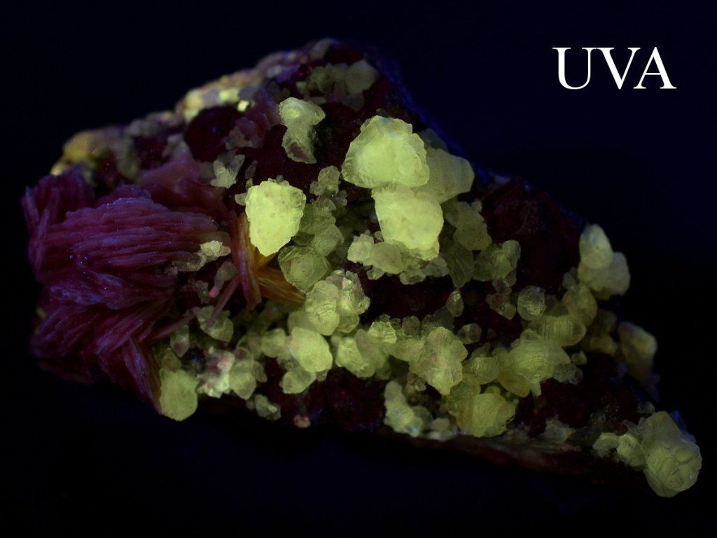 Na fotografii označené UVA je minerál nasvícen dlouhovlnným ultrafialovým světlem a jsou zde patrné následující efekty: