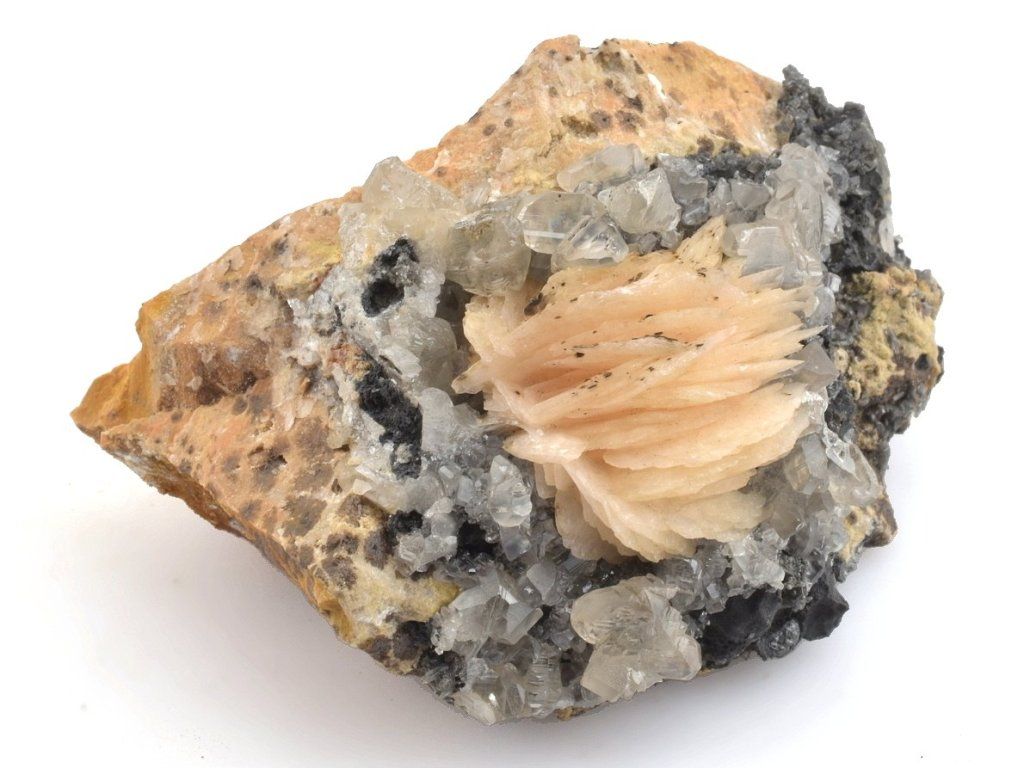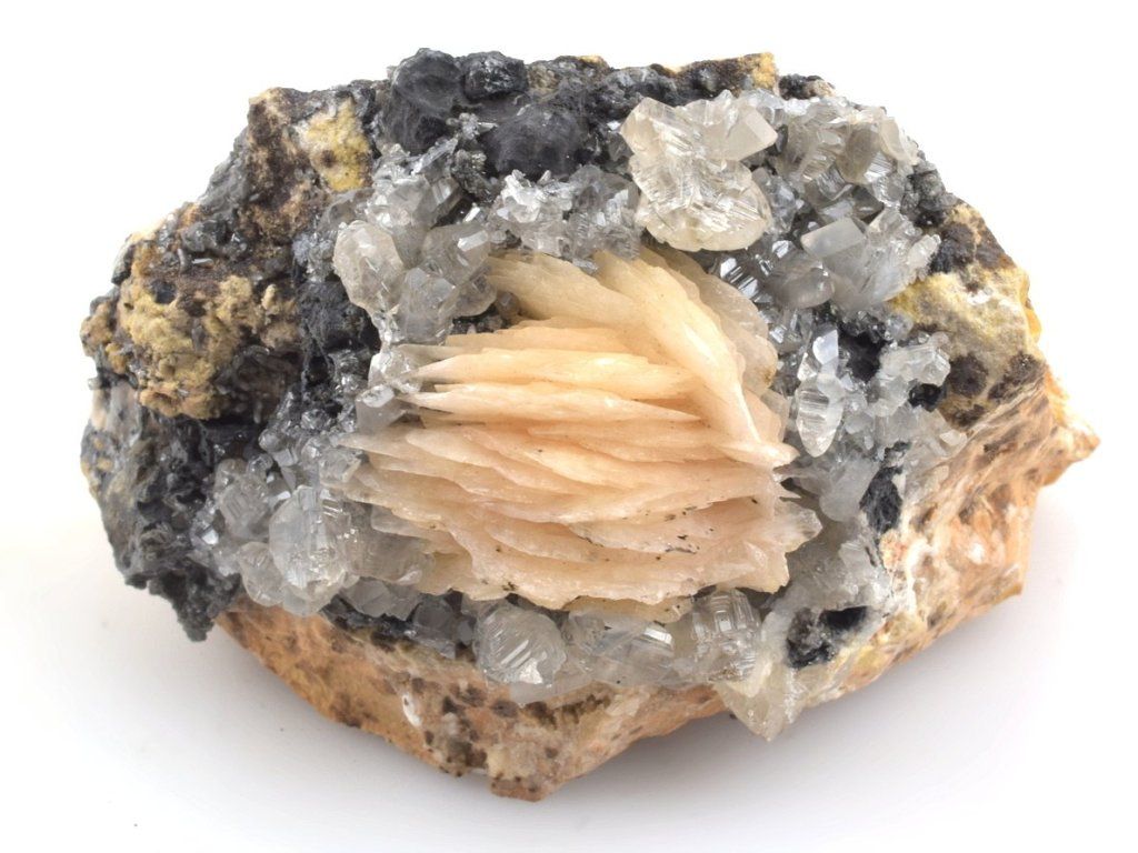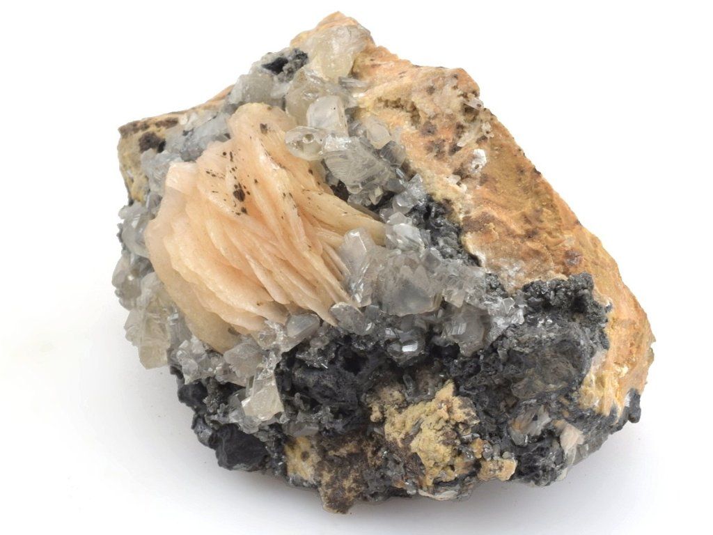 Světlé krystaly cerusitu narůstajících na šedočerném galenitu, doplněná lupenitými krystaly barytu v jemných růžovo-oranžových odstínech.